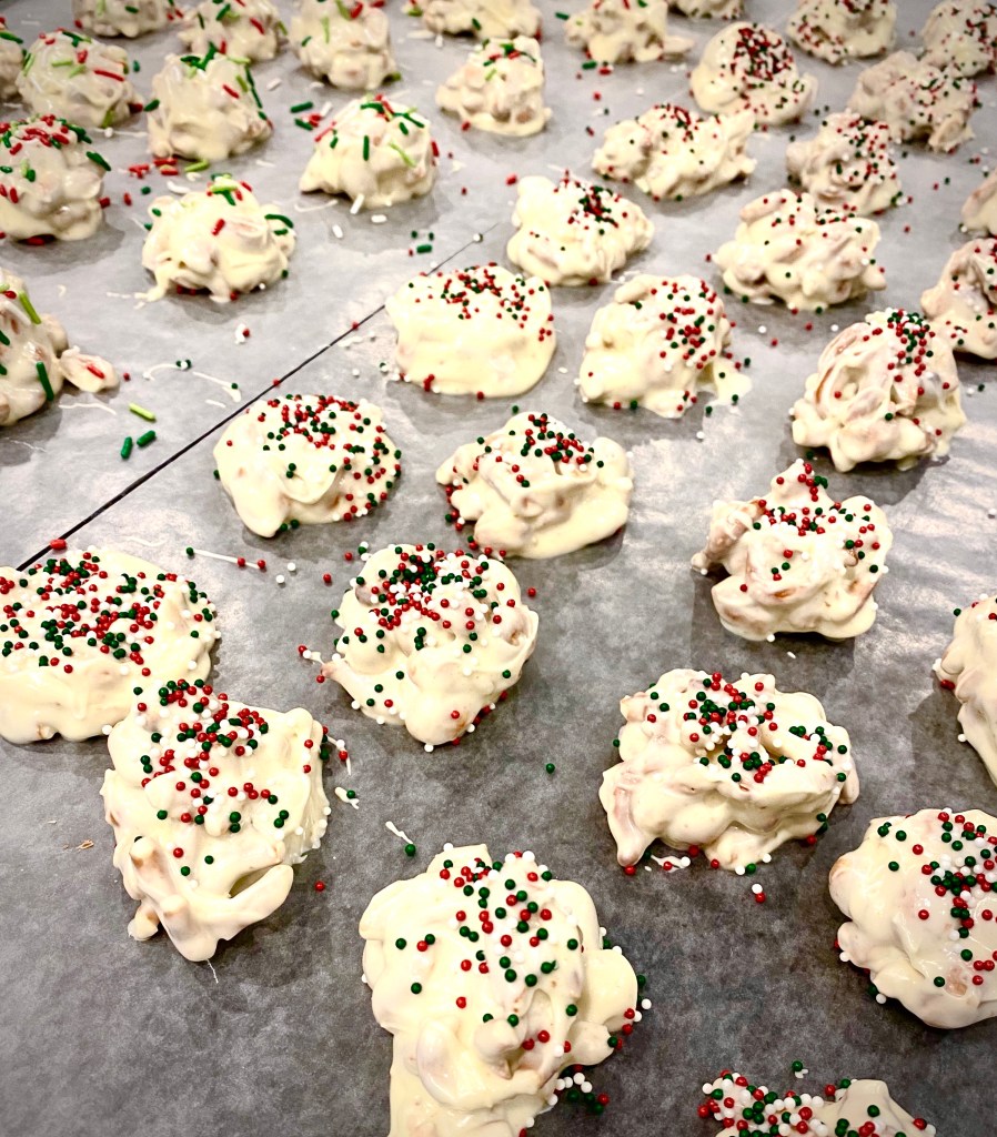 Drop by spoonfuls onto wax paper and add sprinkles. They set up pretty quickly!