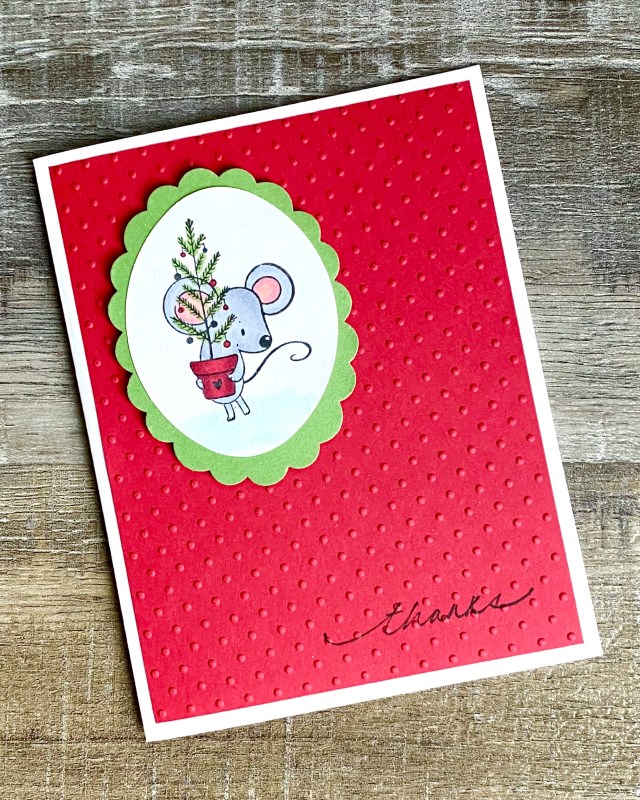 I stamped the word “thanks” with the Memento Tuxedo Black ink on a panel of red card stock. (My stamp is an older one I’ve had forever, this one would be really cute.) Then I embossed the panel with a Dotted Swiss embossing folder. I attached the panel to a white card and the mouse image is attached to the card with foam tape.