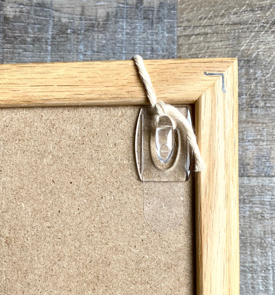 First attach the Command hooks to the top corners of the back of your board. Be sure to attach them upside down. You will be tying the garland around the hooks and you don’t want it to slip off!