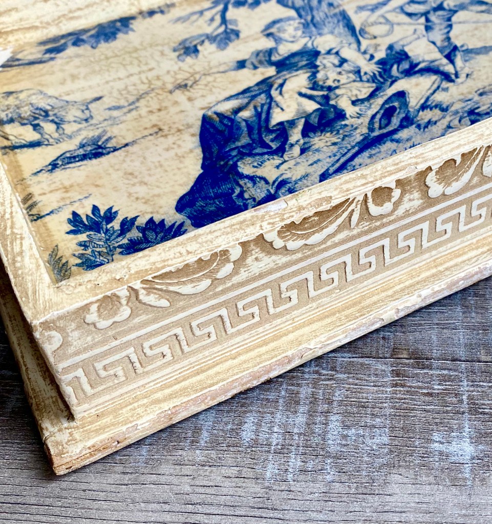 I bought this tray at a thrift store a long time ago thinking it would be a great item to repurpose. It wasn’t something that would go with my decor, but I loved the detail on the sides and thought, with a little paint, I could make it a beautiful piece for my home.
