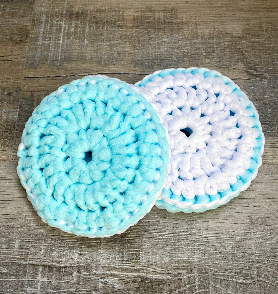 Place wrong sides of scrubbies together, lining up stitches, and ss through both layers all the way around. Fasten off and weave in end.