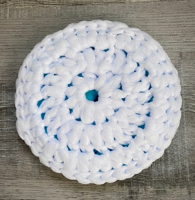 Make another scrubby from 2nd color of tulle but DO NOT fasten off after round 3. Weave in end at beginning of 2nd scrubby.