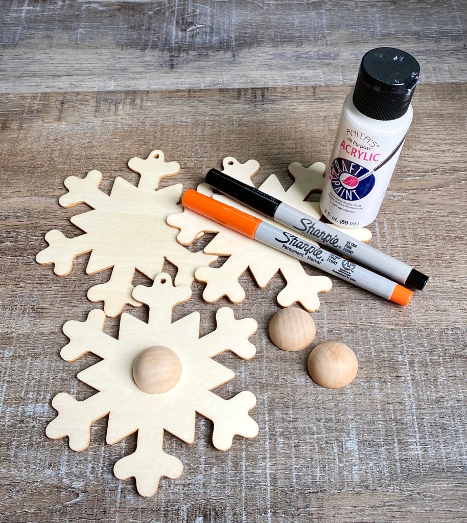 You’ll need wood snowflake ornaments (3-4 inches), 1-inch split wood balls, white acrylic paint, an orange and black ultra fine point sharpie, some twine, clear matte sealing spray, and a strong craft glue (I like E6000 clear adhesive).