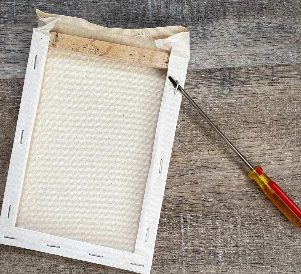 First you’ll need to remove the canvas from the wood frame it is wrapped around. I used a screwdriver to gently pry the staple from the frame. Be careful doing this – it can be a little hard to get the edge of the screwdriver under the staple at first! Here is how it will look once the canvas is removed.