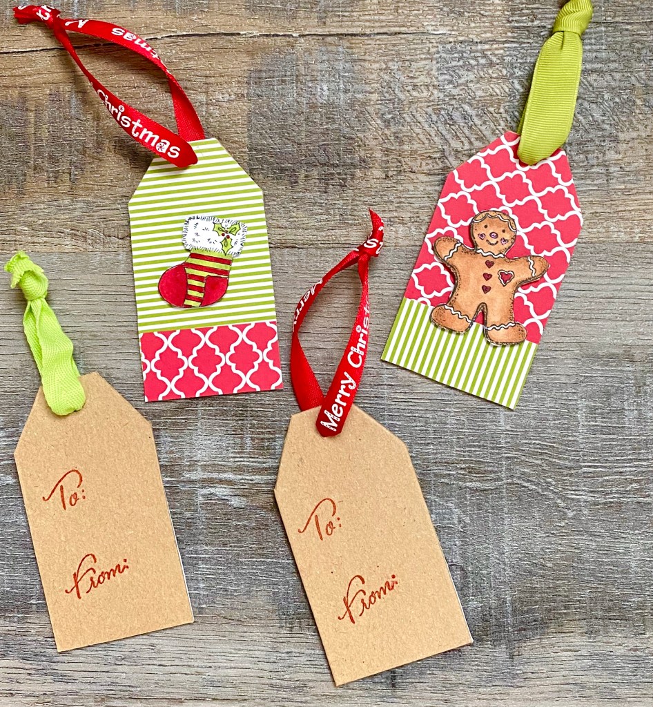 I stamped some of my favorite simple Christmas images on white card stock and colored them with Copic markers. I cut them out and adhered them to the tags with foam tape. I stamped “to” and “from” on the back of the tags. I punched through the paper at the top, lining it up with the hole in the tag, and tied some matching ribbon to the tags.