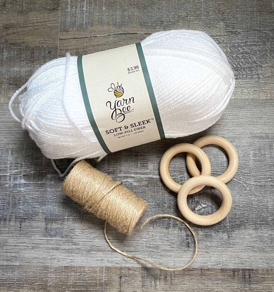 You’ll need some 2 to 2.5 inch unfinished wood rings (these are similar to what I used). You’ll also need worsted weight yarn (I used Yarn Bee Soft & Sleek in white), natural jute twine, and a large-eyed blunt end needle for weaving in the twine.