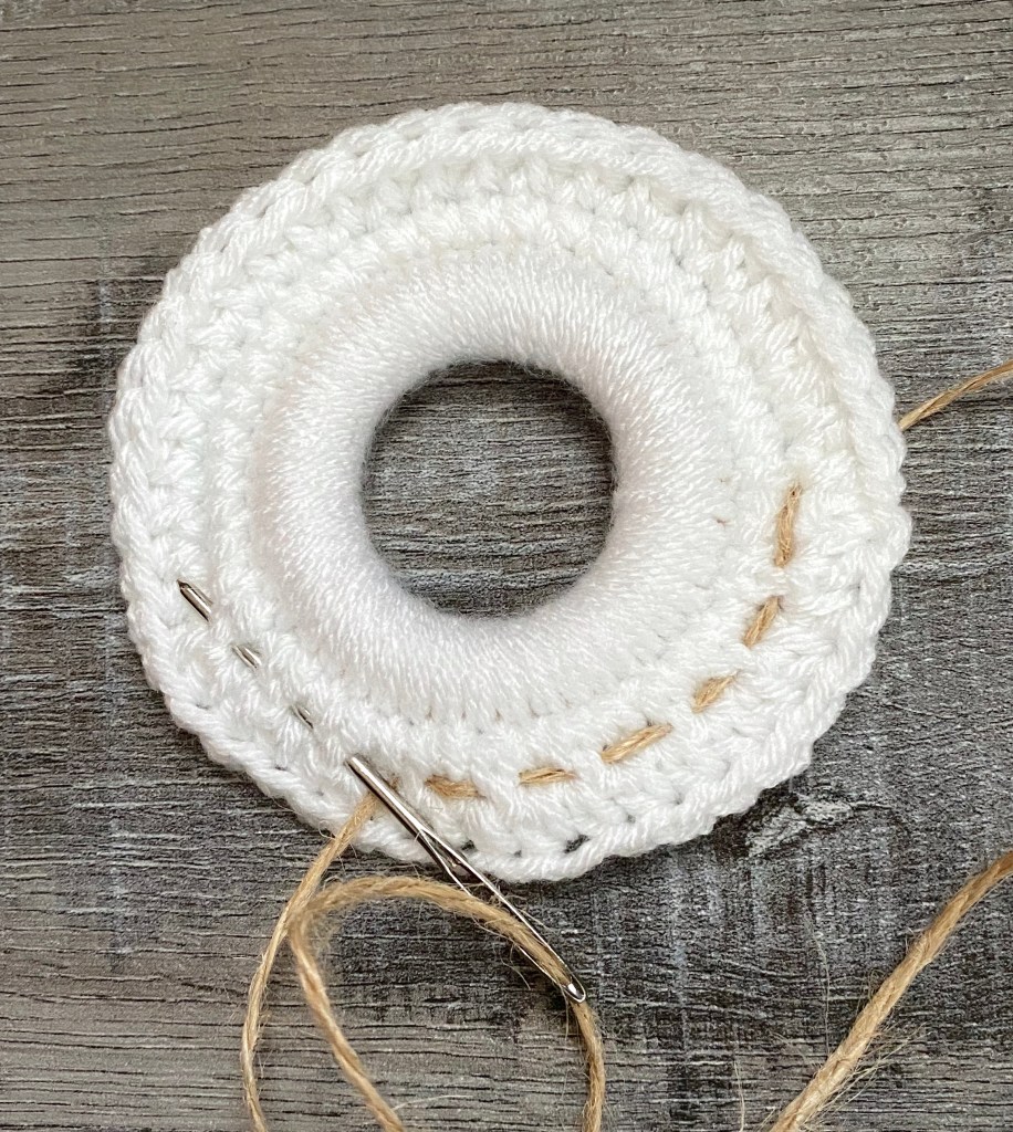 Using the large-eye blunt needle, weave a length twine around the wreath between the 2nd and 3rd rounds. Leave ends long enough to tie in a bow.