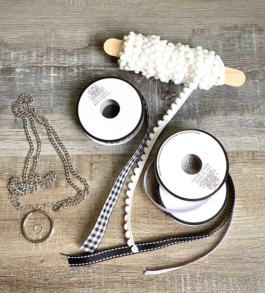 You’ll need ribbon – I used 4 different ribbons. A split key ring – mine measures just over an inch in diameter. A small jump ring (this set has a variety of sizes) and a necklace chain that will fit through your jump ring. My chain was a premade one measuring about 30 inches that I had picked up at Michael’s. You can also buy chain in bulk on a spool, cut it to your desired length, and add your own jewelry findings to the ends to make your necklace chain.