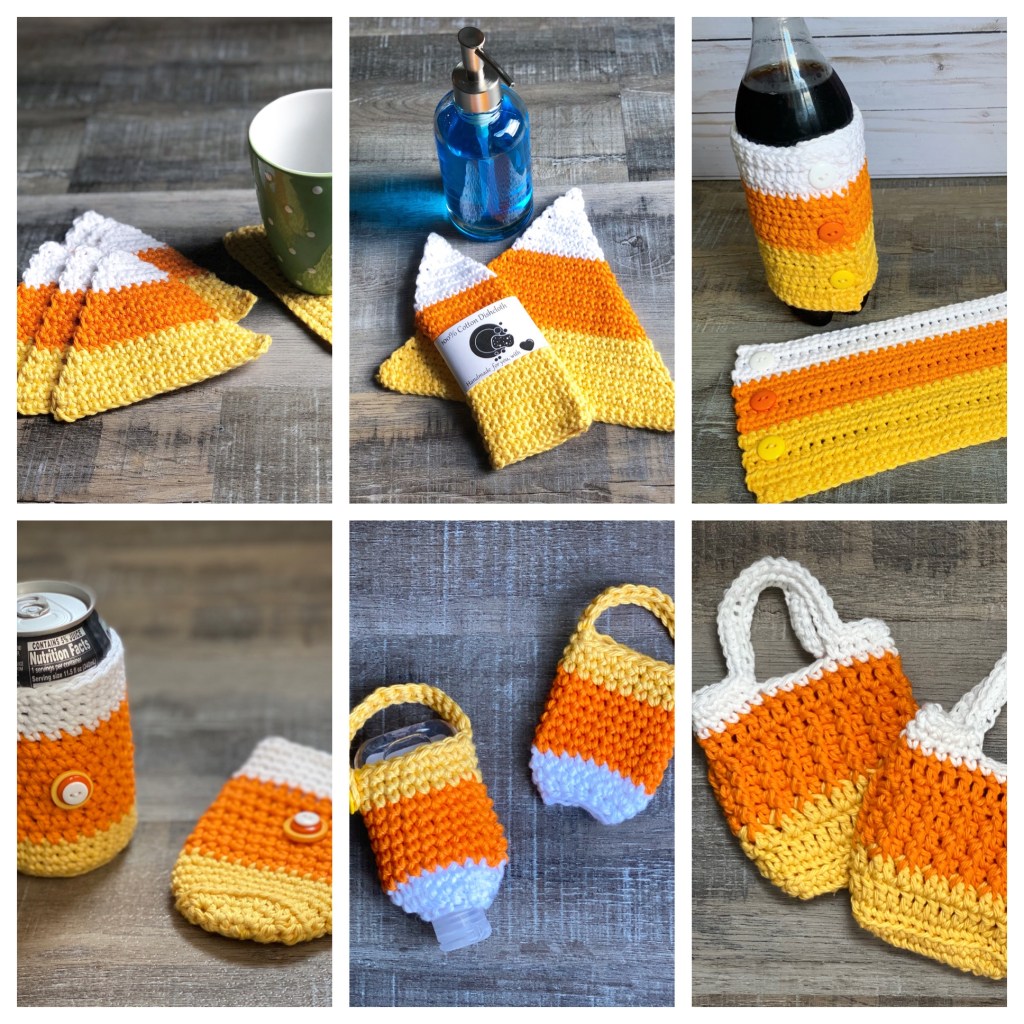 Since we are all carrying hand sanitizer these days, here’s a cute Candy Corn Hand Sanitizer Holder. This quick pattern is here.