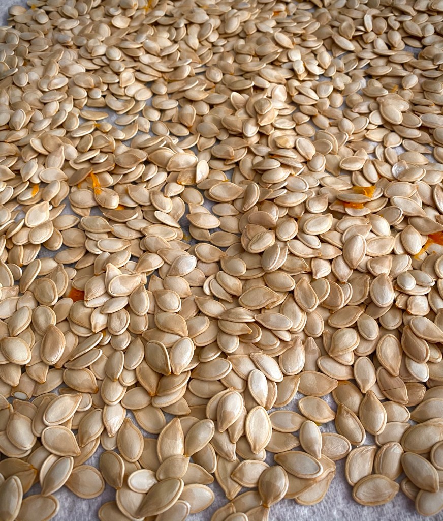 Pull the seeds away from the “stringy” pulp in the pumpkin and place in a bowl of cold water. This will help separate the seeds from the remainder of the pulp. Remove them from the water with a slotted spoon and spread on a baking sheet lined with paper towels to dry. Don’t worry if there is still some pumpkin pulp attached to the seeds. You can blot them with paper towels to help them dry more quickly. Drier seeds will crisp up better when you roast them – let them dry 15 to 20 minutes.