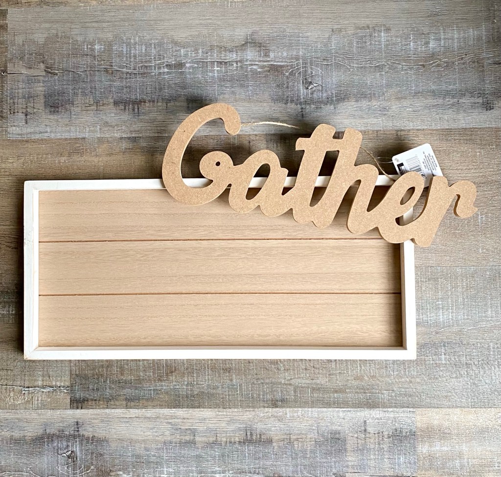 Farmhouse signs are everywhere! The sentiments run the gamut from single words to entire verses – just about anything you can think of. I’ve been wanting to make a sign of my own for a while. And when I found this MDF “Gather” word (it measures about 5 by 15.5 inches) at Dollar Tree I knew what I wanted to do.