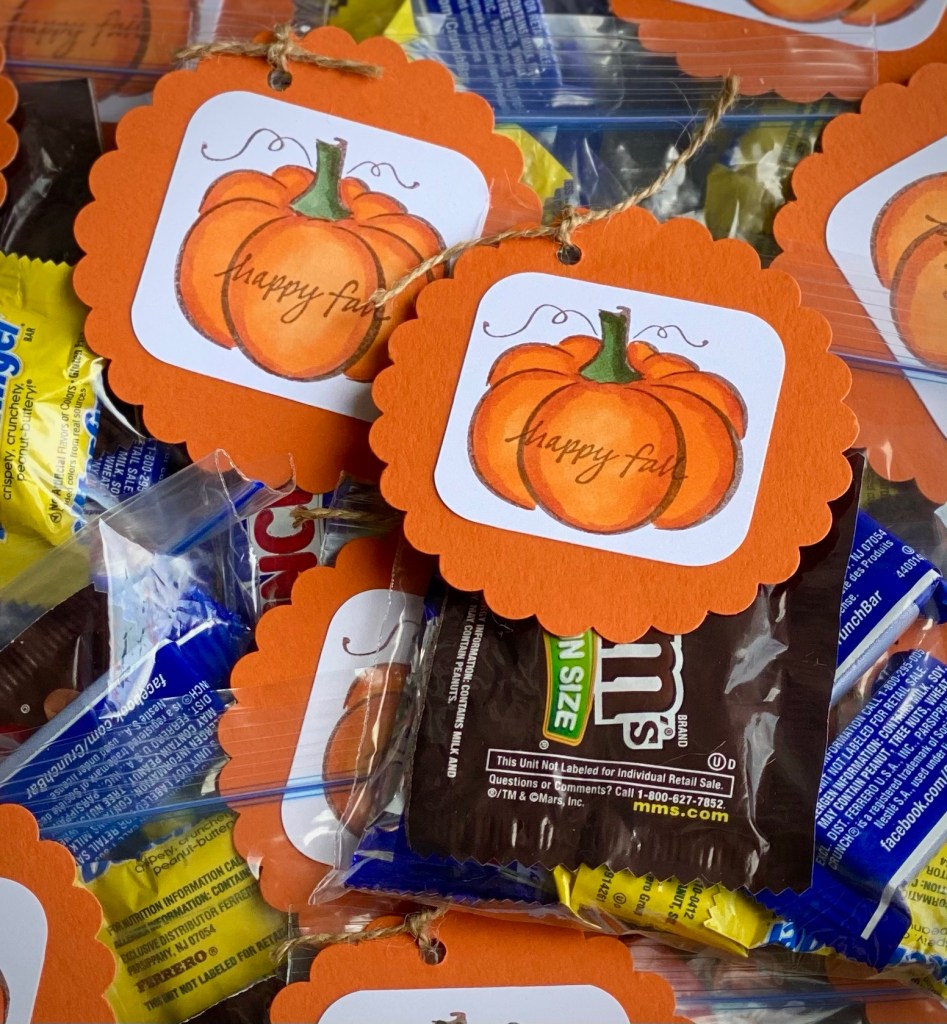 There’s still time to make up some of these quick tags to add to treat bags for those special little trick or treaters who may be ringing your doorbell tomorrow night! Not doing the Halloween thing this year? These will also be fun as Thanksgiving favors at each place setting – even if it is just your immediate family. We all need to add a little joy where we can find it. 😊