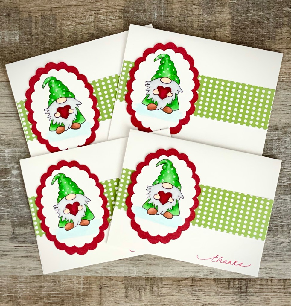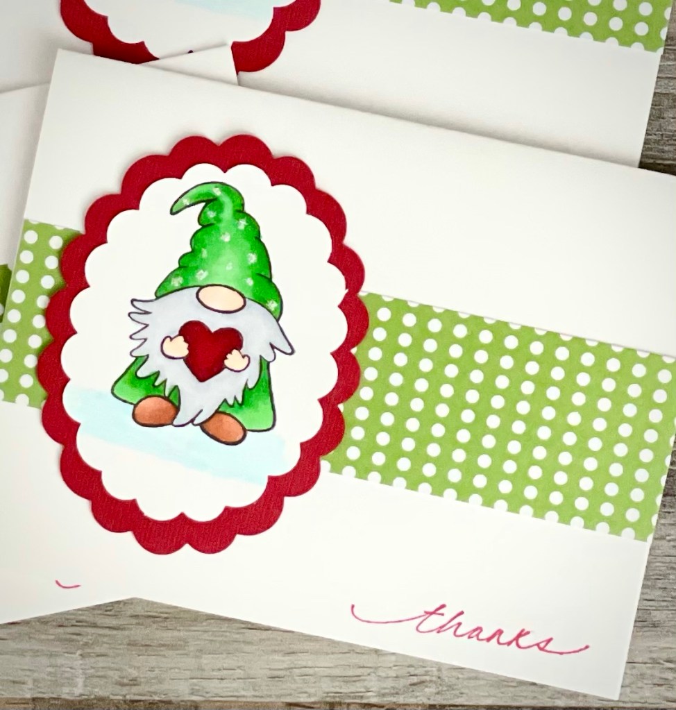 I thought it would be fun to color this cute gnome in Christmas colors and make him into a thank you card. He’s perfect for saying “thank you” for those special Christmas gifts.
