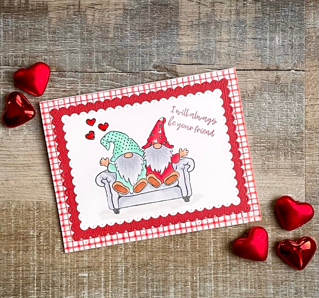 To make this sweet Valentine card, I stamped the Gnomes and the hearts with Memento Tuxedo Black ink on white card stock and colored them with Copic markers. I stamped the sentiment with red ink.