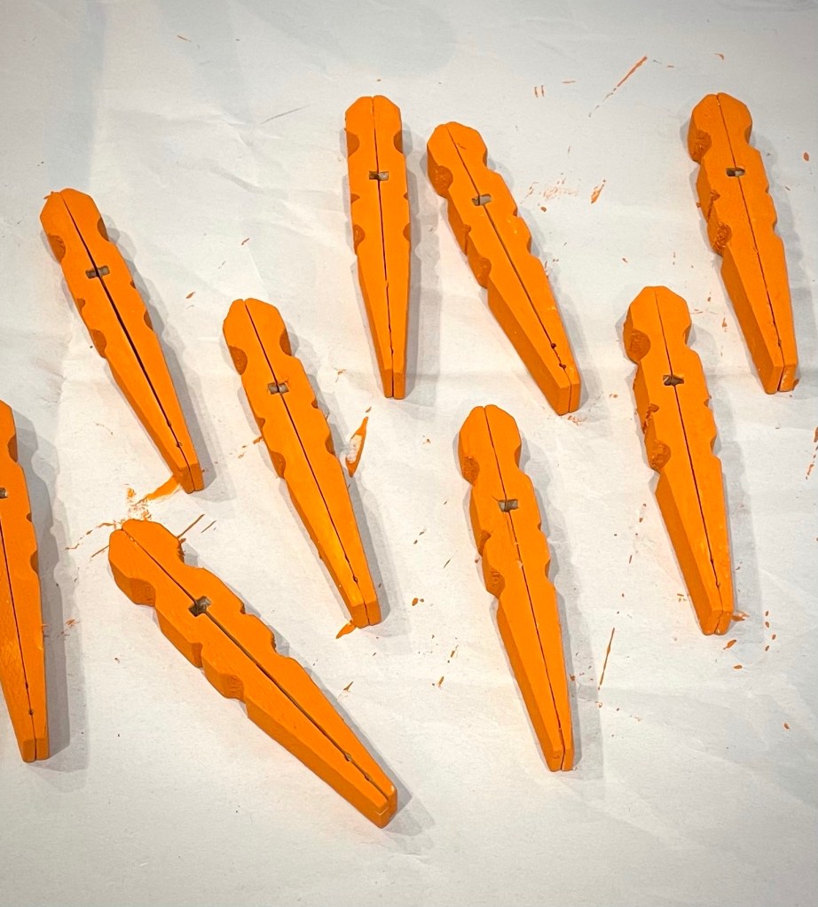 Then paint the clothespins with orange chalky finish or acrylic paint – both kinds of paint will work. I had chalky finish paint on hand so that’s what I used. I painted 2 coats, letting it dry between coats. I didn’t paint the flat sides of the clothespins since they are glued together.