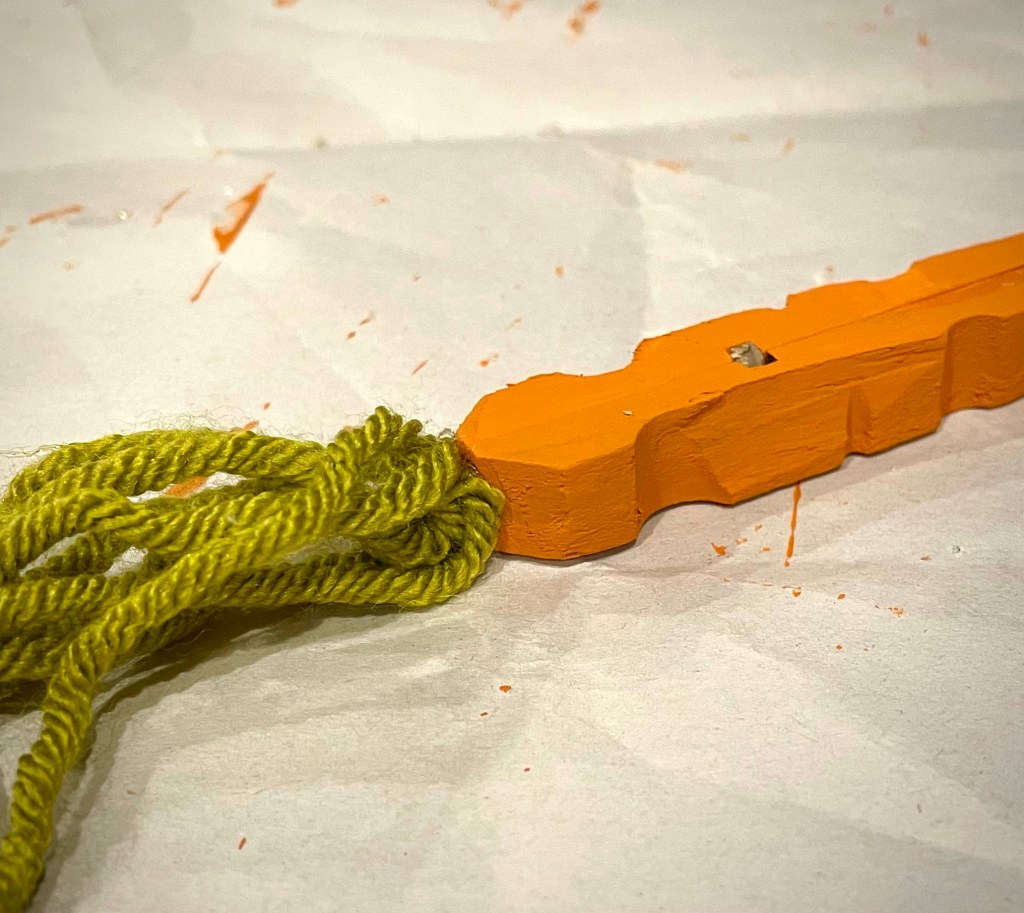 All you need are some spring-type clothespins, orange paint, (this is a great set of paints if you need to resupply your craft room) and green yarn. You’ll also need a hot glue gun to attach the yarn. I used E6000 clear adhesive to glue my clothespins together, but hot glue would work, too.