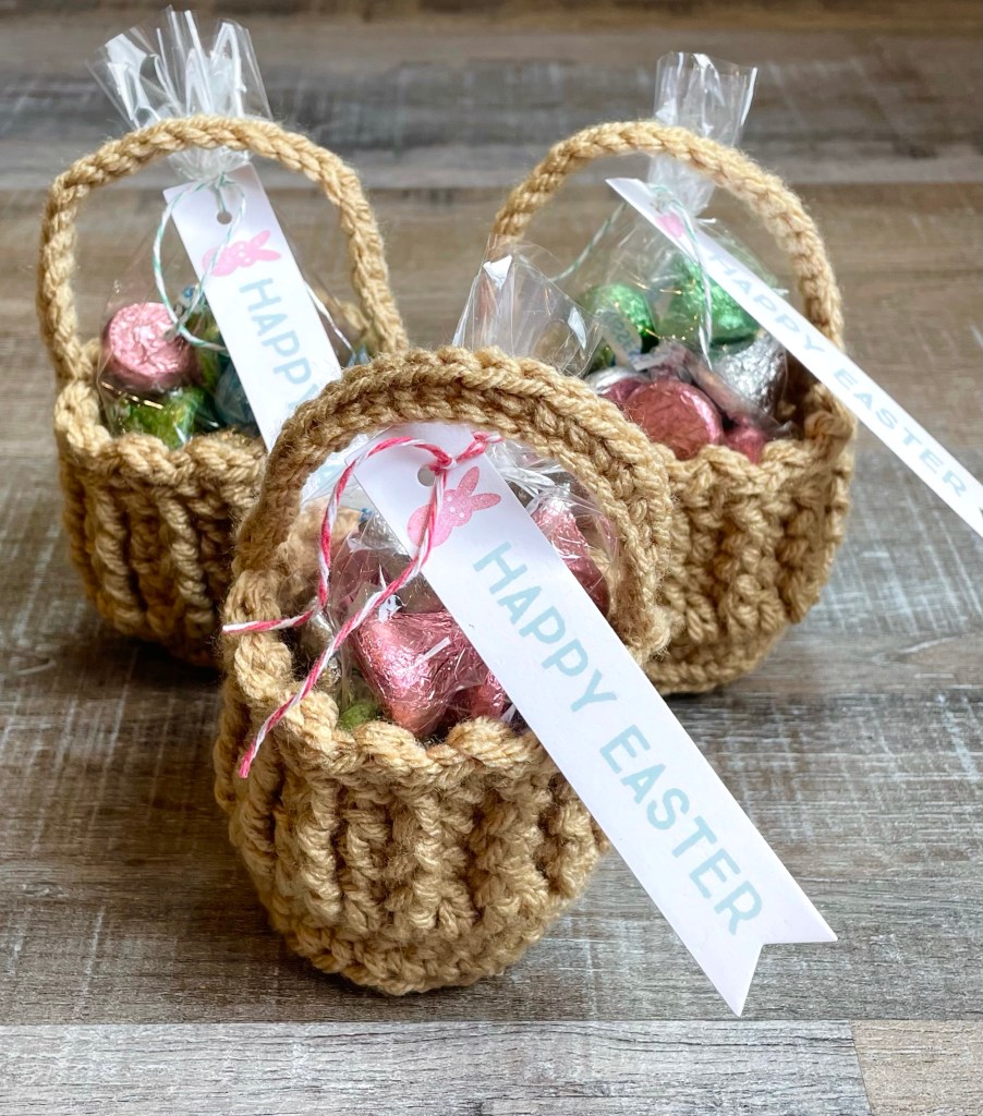 Do you have any little bunnies that you would like to give a sweet Easter treat? This Treat-Size Crochet Easter Basket is just perfect for giving some chocolate or jelly beans. It measures about 2.75 inches tall before adding the handle and will hold about 18-20 Hershey’s Kisses or a handful of Jelly Beans in a small cellophane treat bag.