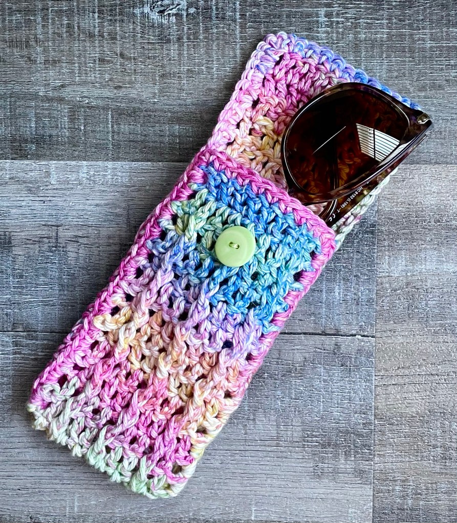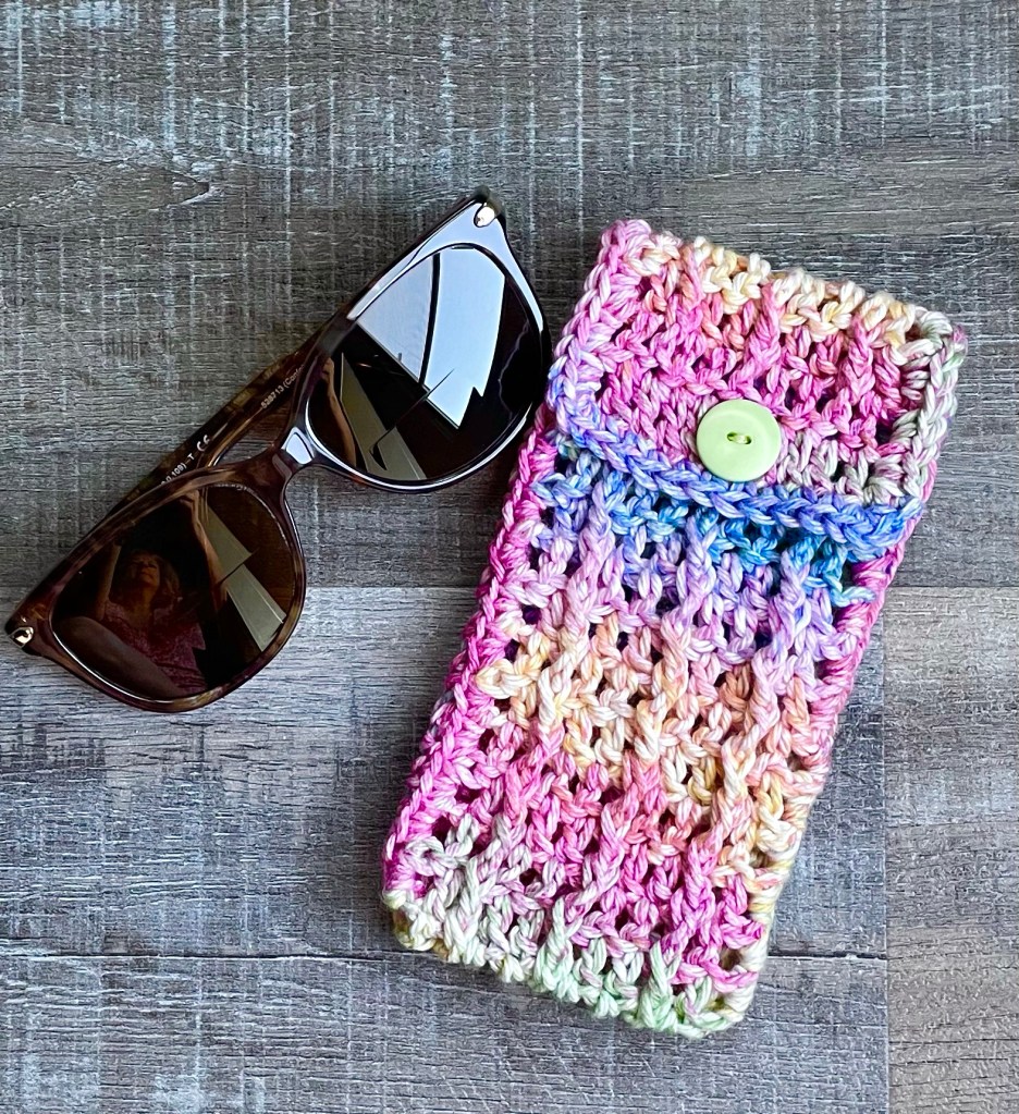 I have a colorful quick and easy Crochet Summer Sunnies Pouch so you can keep your sunglasses close by. It’s perfect to throw in your purse or beach bag and the button closure will keep your sunnies from sliding out.