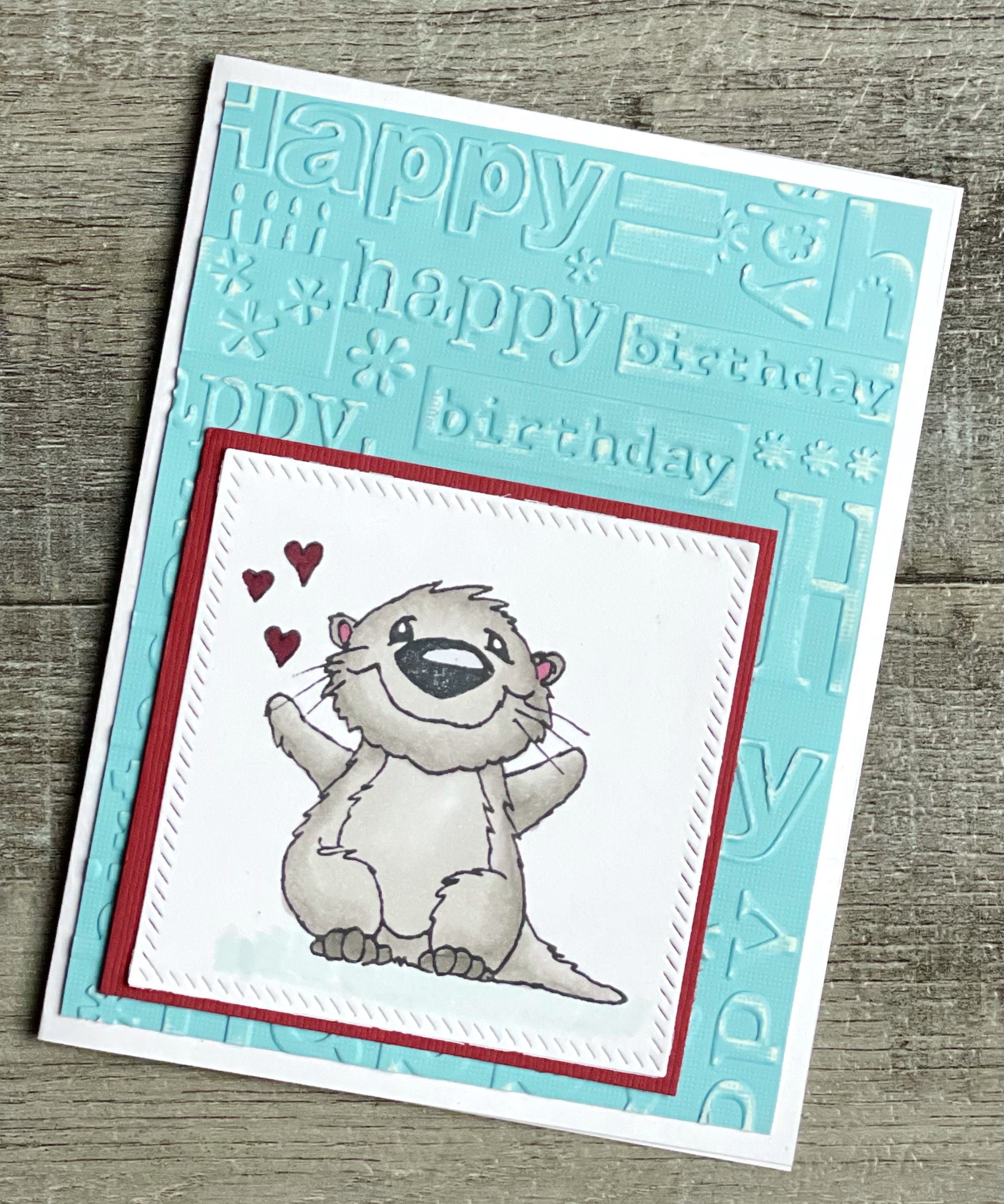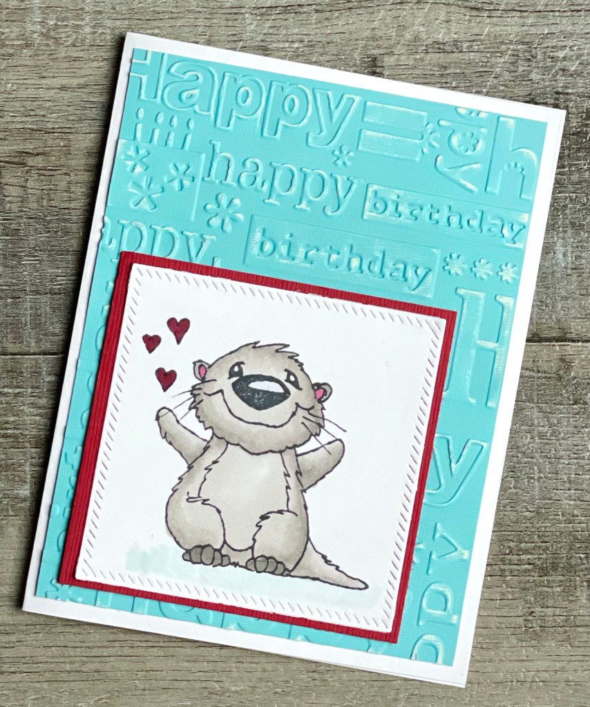 For the sweet Otter card, I die cut him using the Pink Fresh Studio Essentials Diagonal Stitches Square die set and layered the image to red card stock. I embossed a piece of turquoise card stock that had a white core using a birthday embossing folder. (I don’t think the one I used is available anymore, but I love this one!) Then I lightly sanded the raised areas to bring out the white core and attached it to a white card. The otter is attached the the card with foam tape.