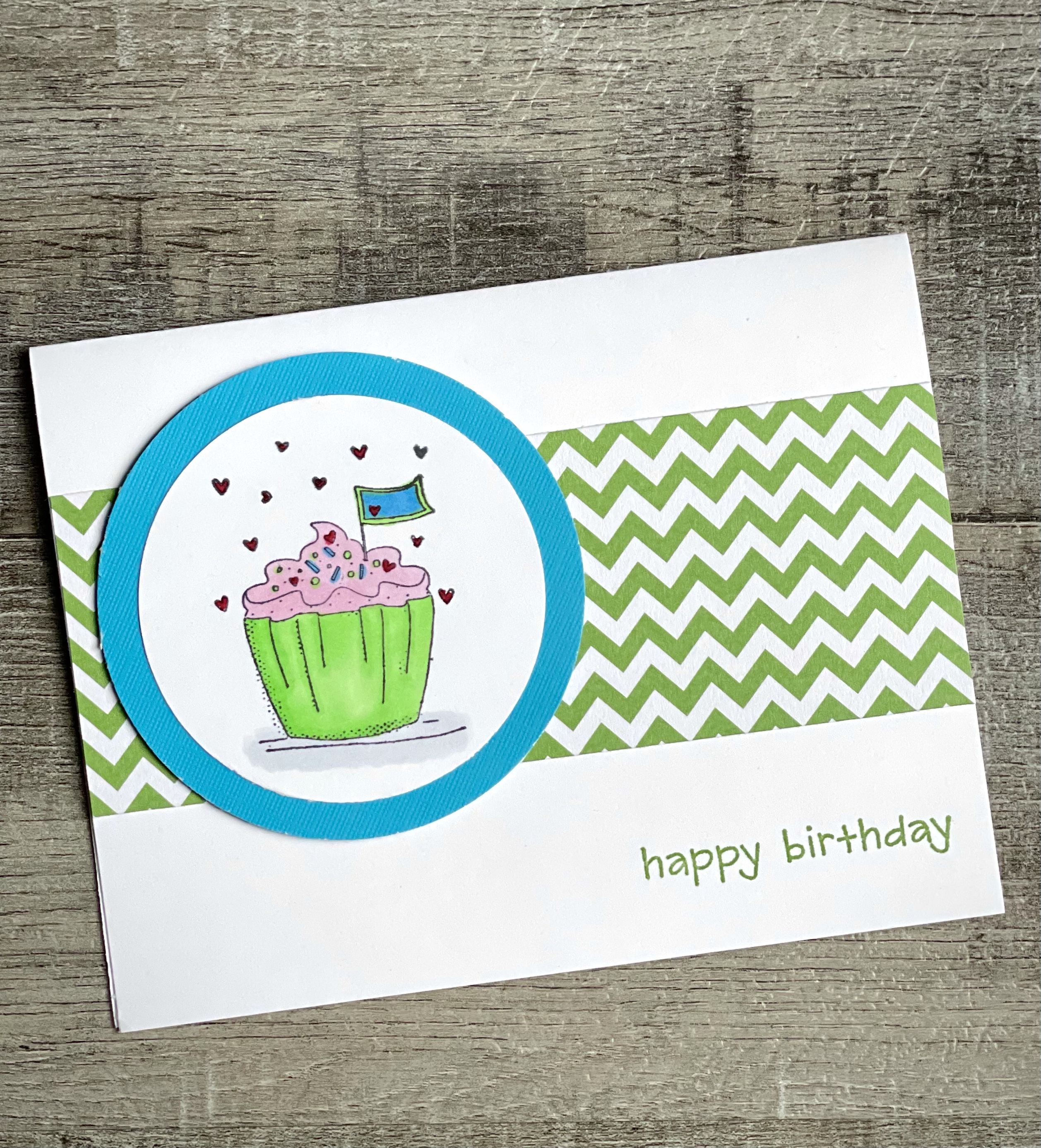For the Cupcake card, I die cut the image with a circle die and layered it to a larger blue card stock circle. (This is a great set of circle dies.) I attached a strip of patterned paper to a white card and stamped the sentiment with green ink. I attached the stamped image to the card with foam tape.