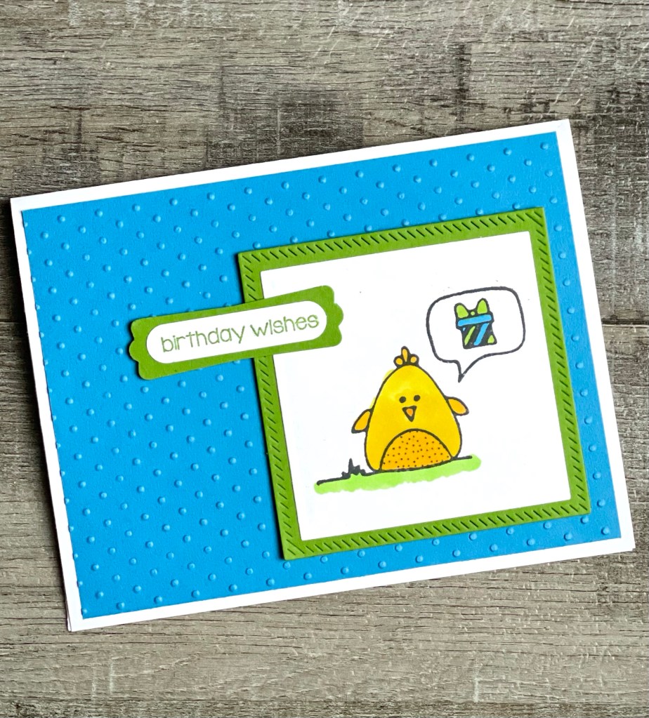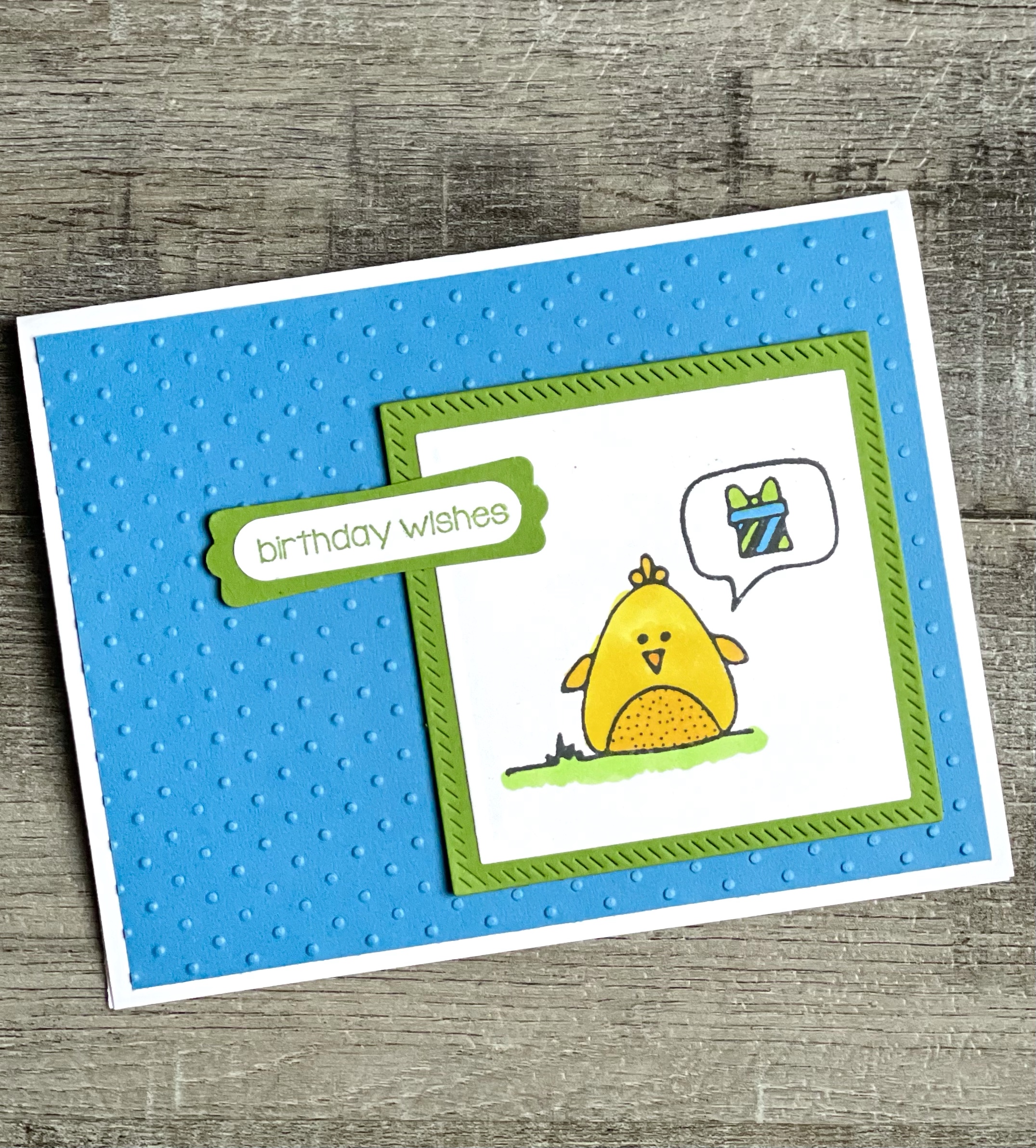 For the Birthday Peep card, I trimmed the stamped image and then layered it to a green card stock square die cut using Pink Fresh Studio Essentials Diagonal Stitches Square die set. I embossed a panel of blue card stock with a dot embossing folder (similar to this) and attached it to a white card. I stamped the sentiment with green ink on white card stock, punched it with a label punch, and layered it to a larger label punched from green card stock. (The punches I used are no longer available, but this is a great set of label dies if you are looking for some.) The peep image and sentiment are attached to the card with foam tape.