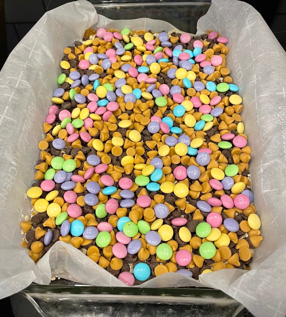 The recipe fills a 9 by 13 inch baking dish so there are plenty of cookie bars for everyone. Here they are ready to put in the oven. Be sure to line your baking dish with parchment paper – it makes it so easy to lift the entire thing out of the dish before you cut them. (I just had a roll of parchment paper, but I am getting these parchment paper sheets when my roll runs out. So much easier to work with!)