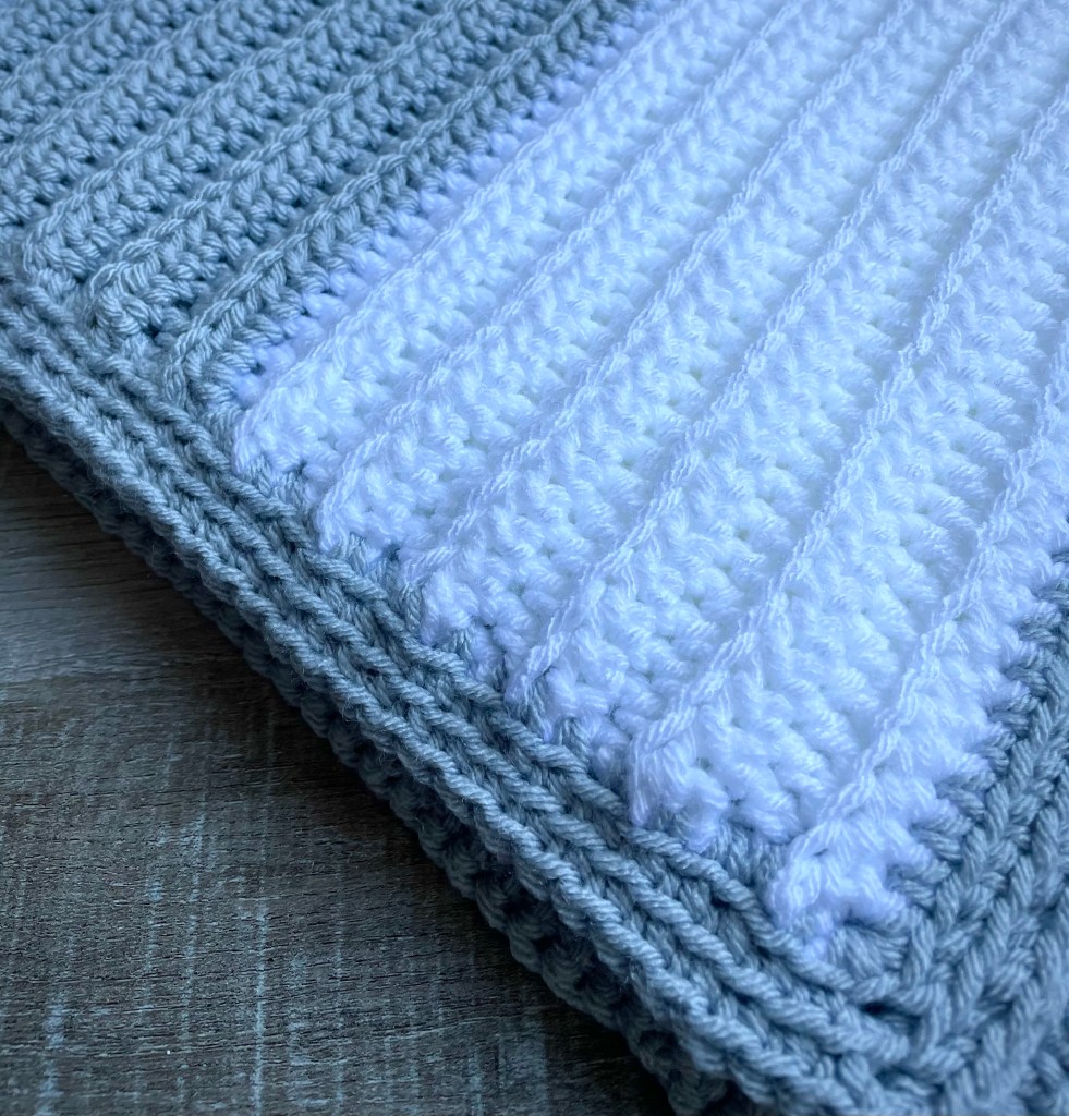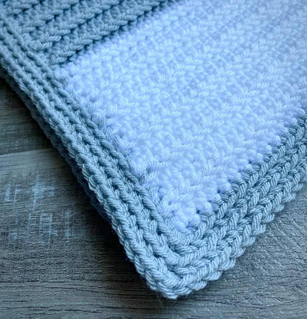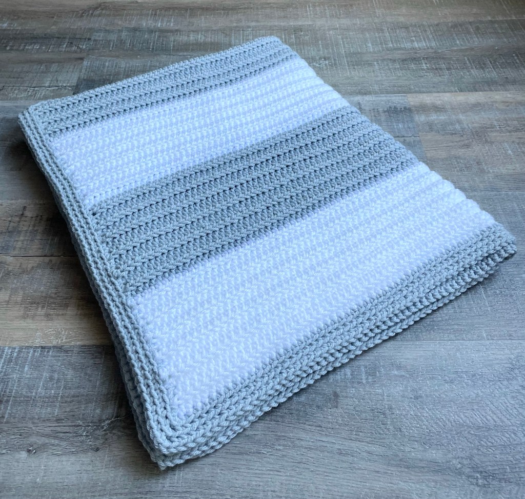 I stitched up my blanket using Yarn Bee Soft & Sleek yarn with a J/6mm hook. Any of your favorite worsted weight (4) yarn will work. Although I made my blanket in White and Silver Grey, this blanket would be so pretty in lots of other color combos to match a new little one’s nursery.