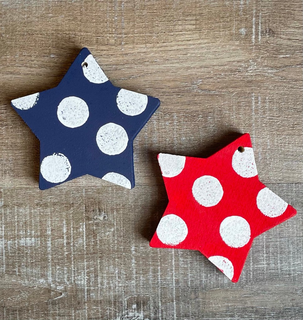 You’ll need red, white, and blue acrylic paint (this is a great set), a paint brush, and a 3/4″ (or smaller) spouncer for making your polka dots. I like this set of spouncers because it has several different sizes to use on all your polka dot projects.