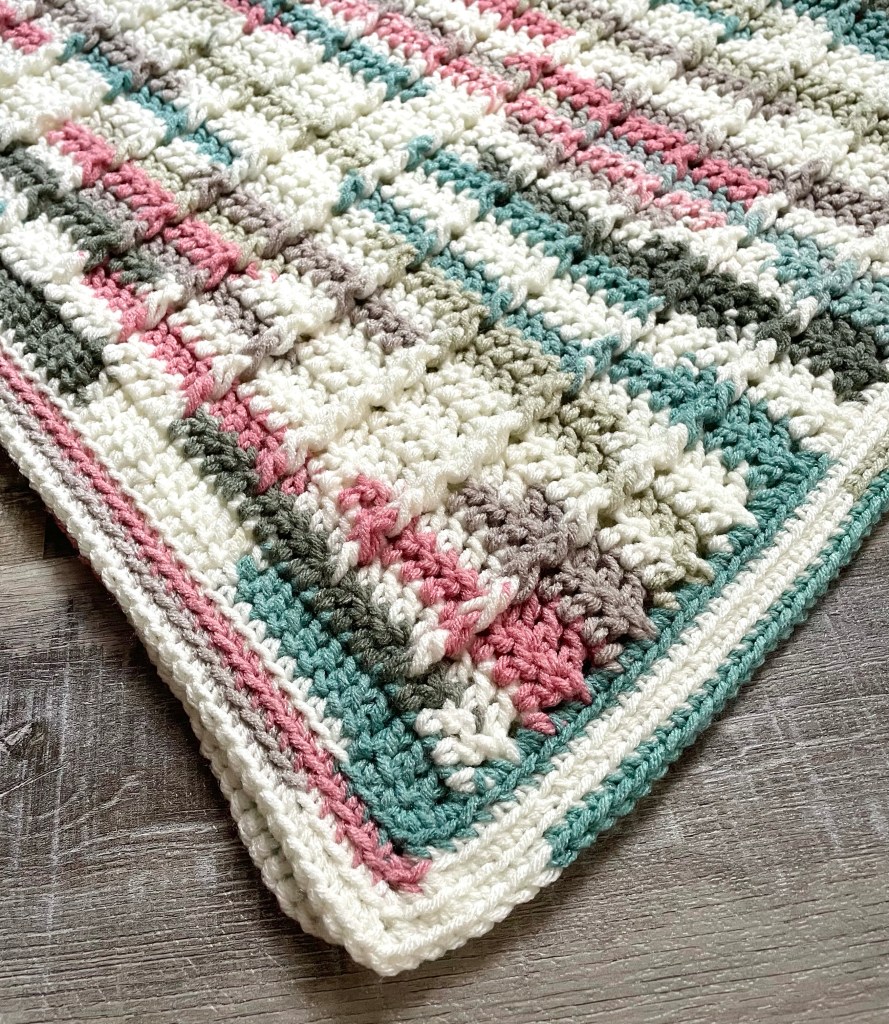 The Crochet Ridged Baby Blanket is a simple repeat of double crochet with front post double crochet and back post double crochet stitches to create the “ridges”. I made this blanket using Yarn Bee Soft & Sleek yarn in Earthblossom and an H/5mm hook.
