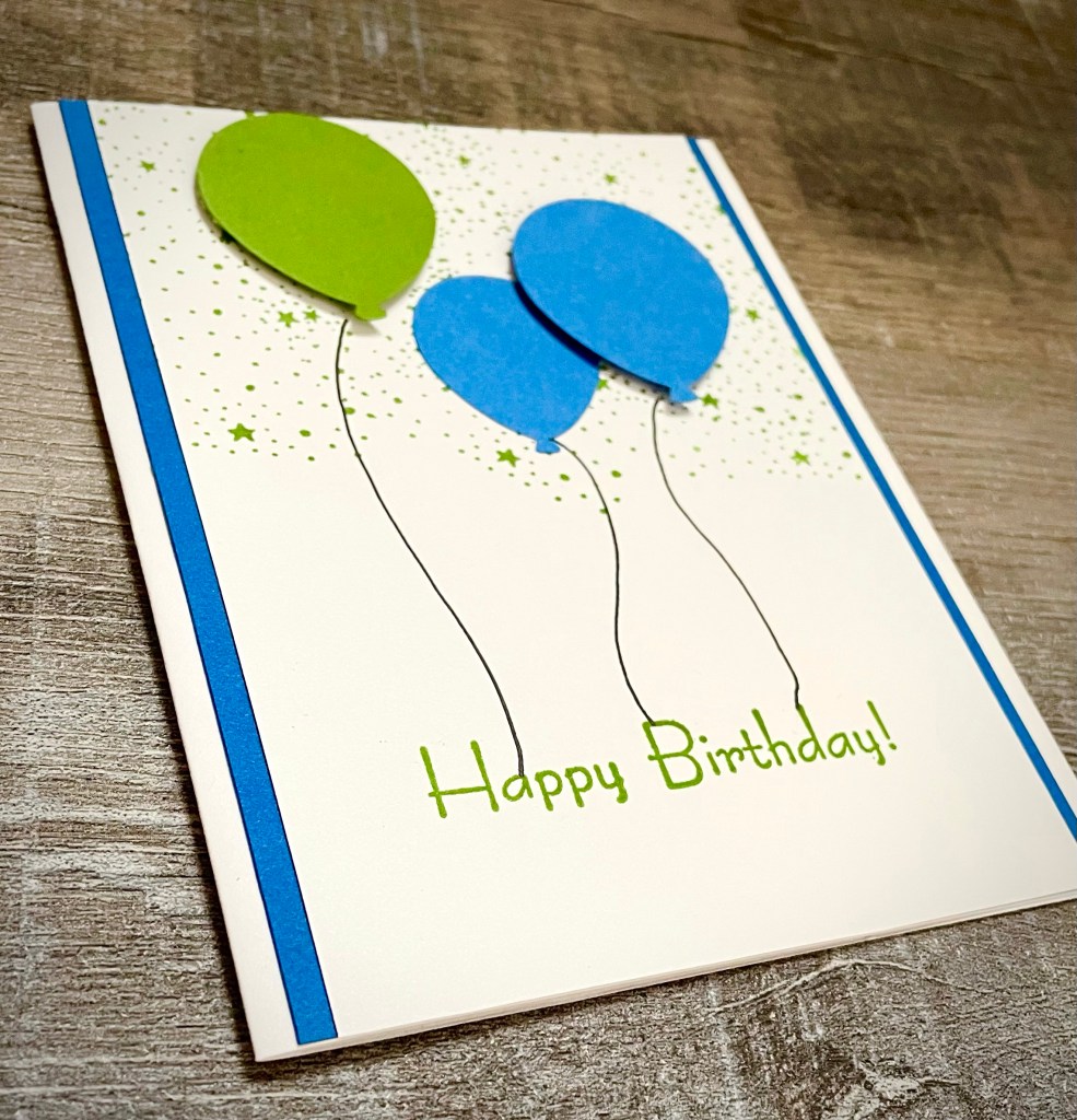This next card is super quick and easy to make. First I punched balloon shapes from blue and green card stock. The punch I used is discontinued but this one or this one would work great.