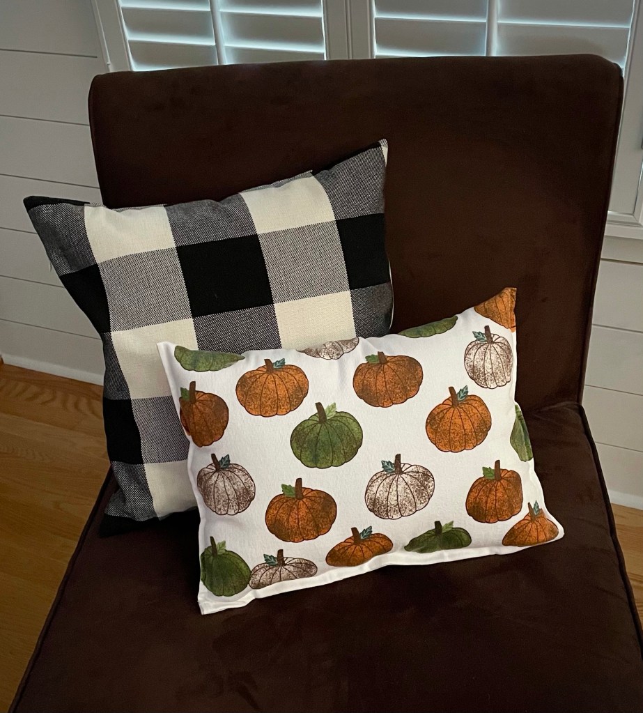 Hereβs my finished pillow. It ended up measuring about 16 by 13 inches. I like that itβs not a standard square pillow – something a little different. π This is such a quick and easy project to add to your Fall decor!