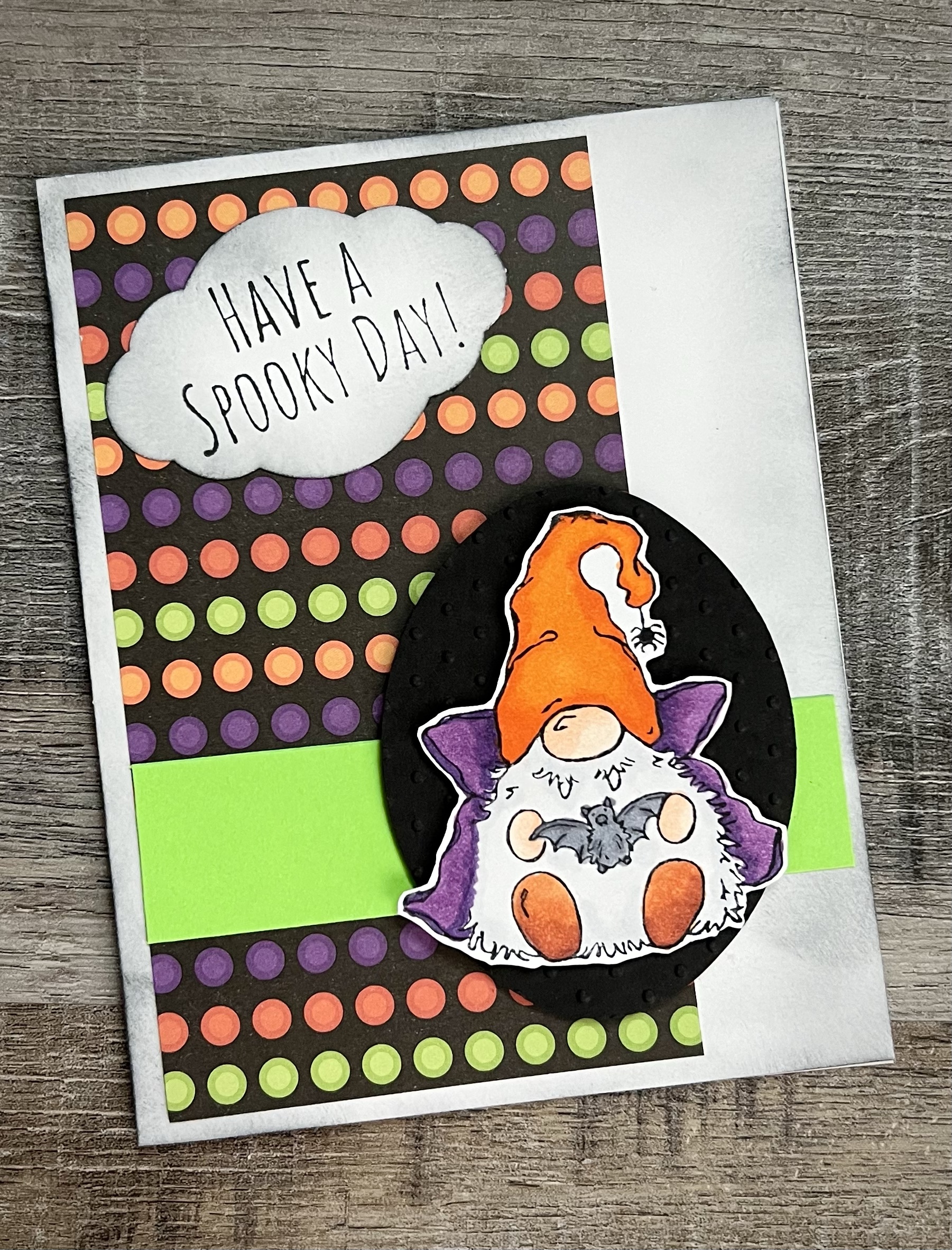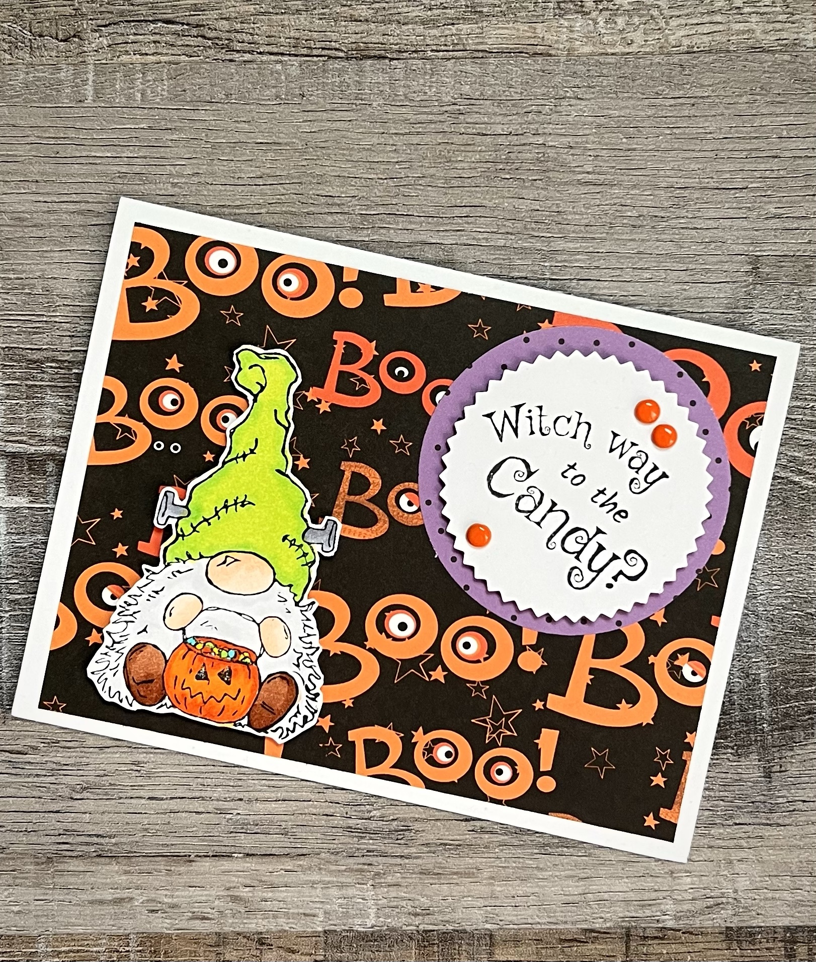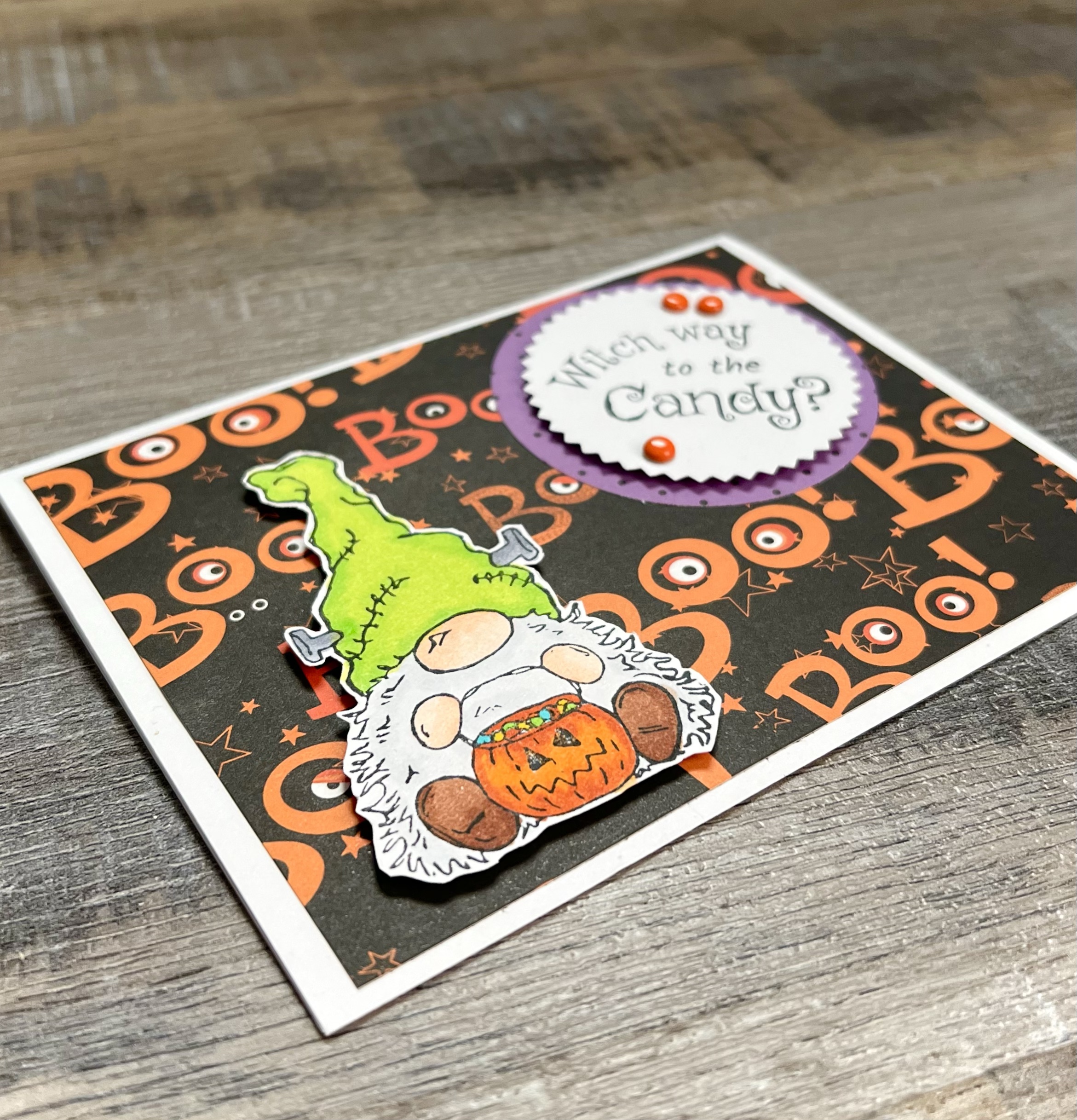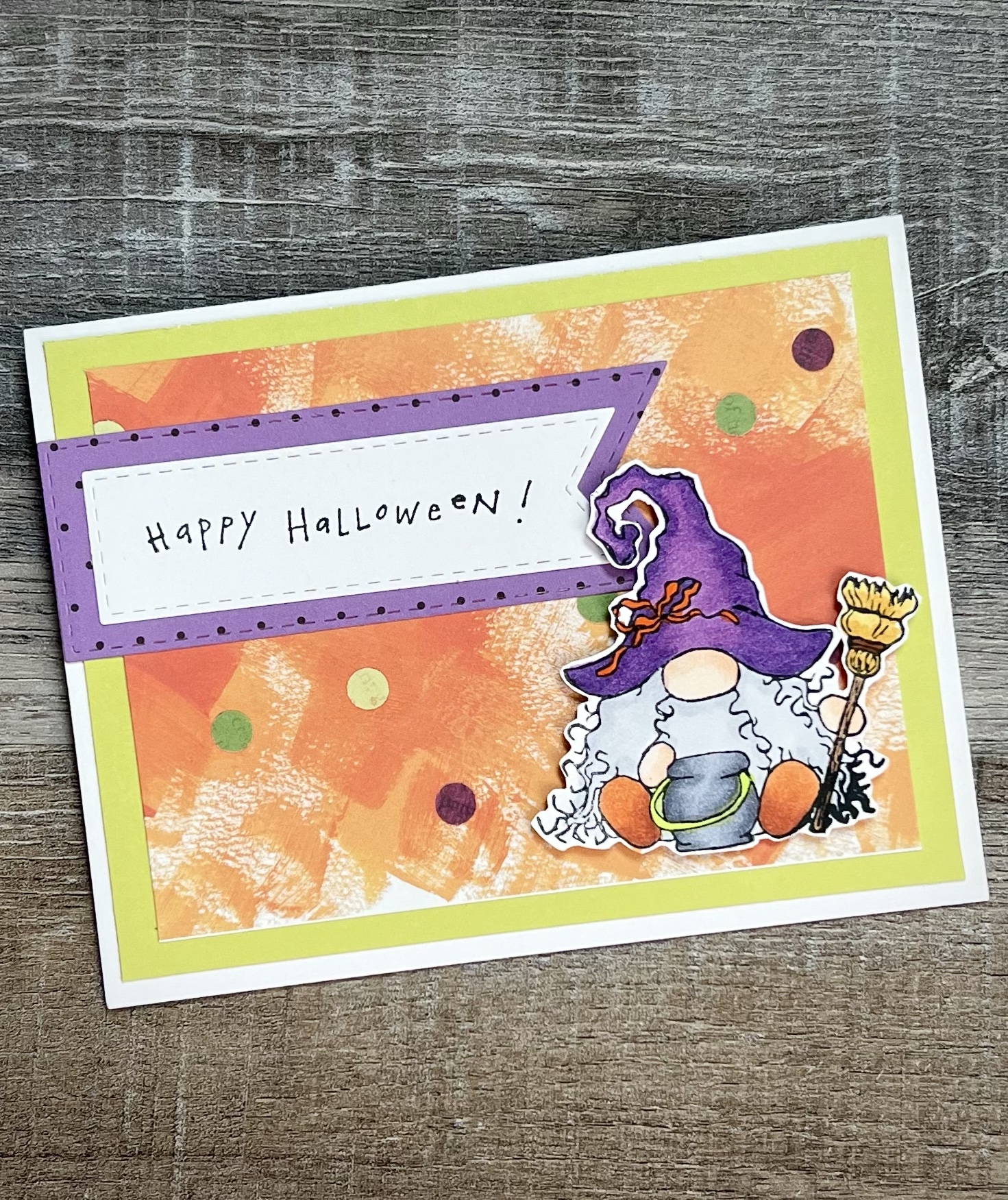 For this card, I stamped the “witch” gnome with Memento Tuxedo Black ink on white card stock, colored it with Copic markers, and then fussy cut around the image.