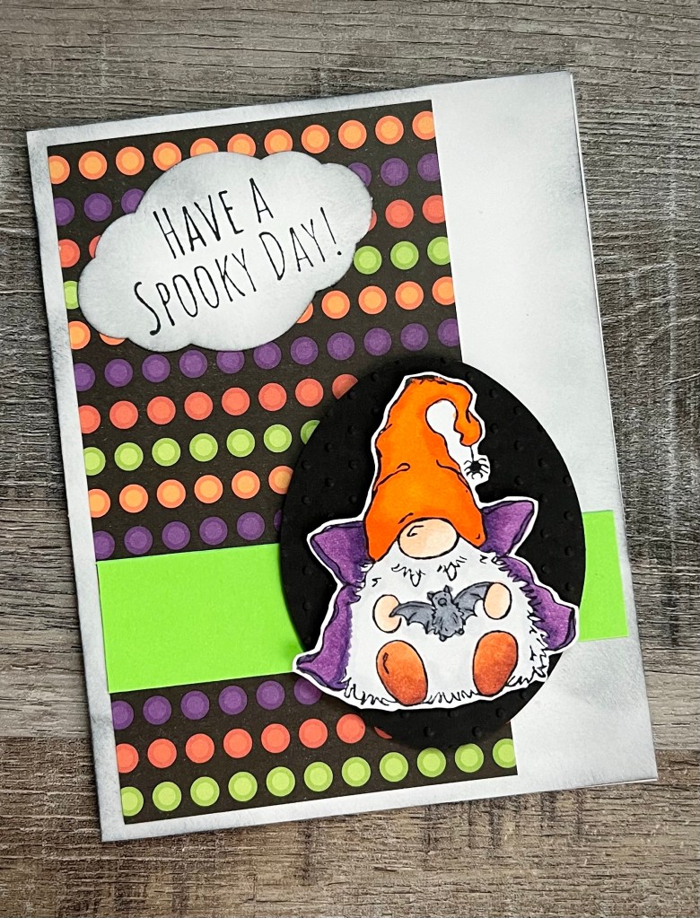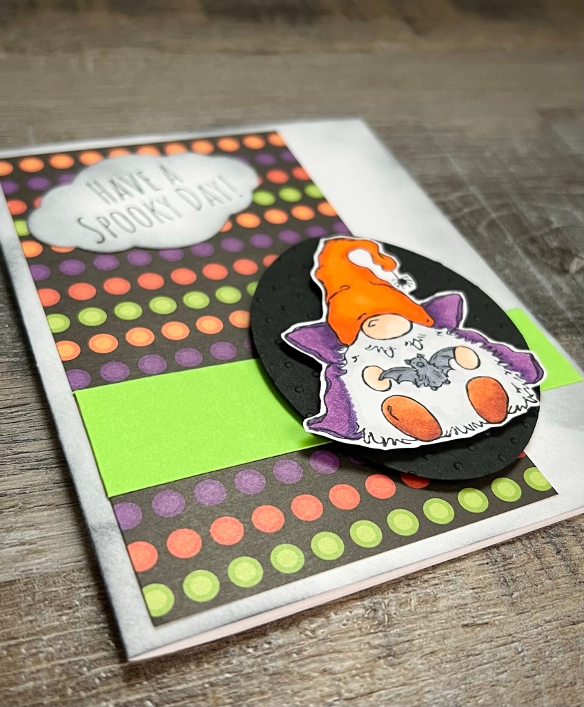 I punched a 3-inch oval out of black card stock. It’s kind of hard to see in the photo, but I embossed the oval with a dot embossing folder. I added a piece of patterned paper to the card after applying the black ink to the edges of the card. Then I added a strip of lime green card stock. I attached the black oval to the card with foam tape and then attached the gnome to the black oval with foam tape. I attached the sentiment piece directly to the card.