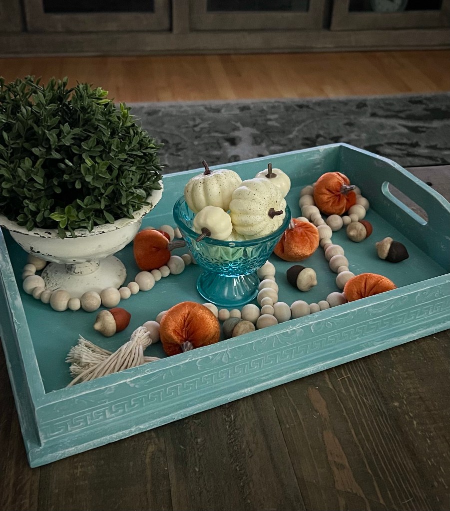 This is a tray I have on our coffee table that is so fun to decorate for the different seasons. And the best part about the tray is that itβs a repurposed thrift store find! You can see the before pic and all the details in this post.