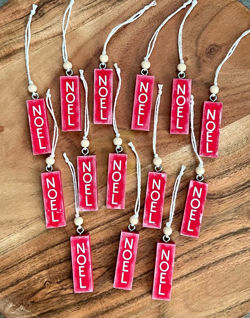 Using my Cricut Explore Air 2, I cut “NOEL” vertically from white permanent vinyl using the Cricut Sans font. Then I applied the word to the front of my wood pieces using transfer tape.