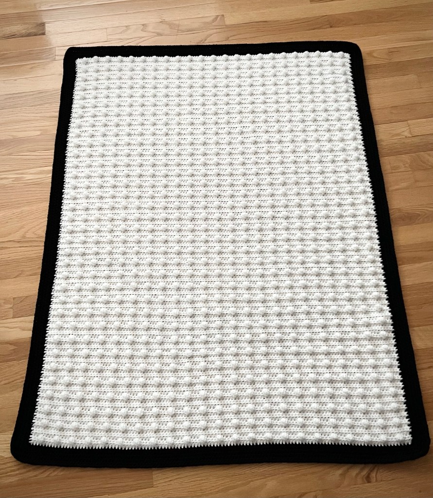 Your blanket should have a total of 34 bobble rows with 1 row of hdc at the beginning, 1 row of hdc at the end, and 3 rows of hdc between each bobble row.