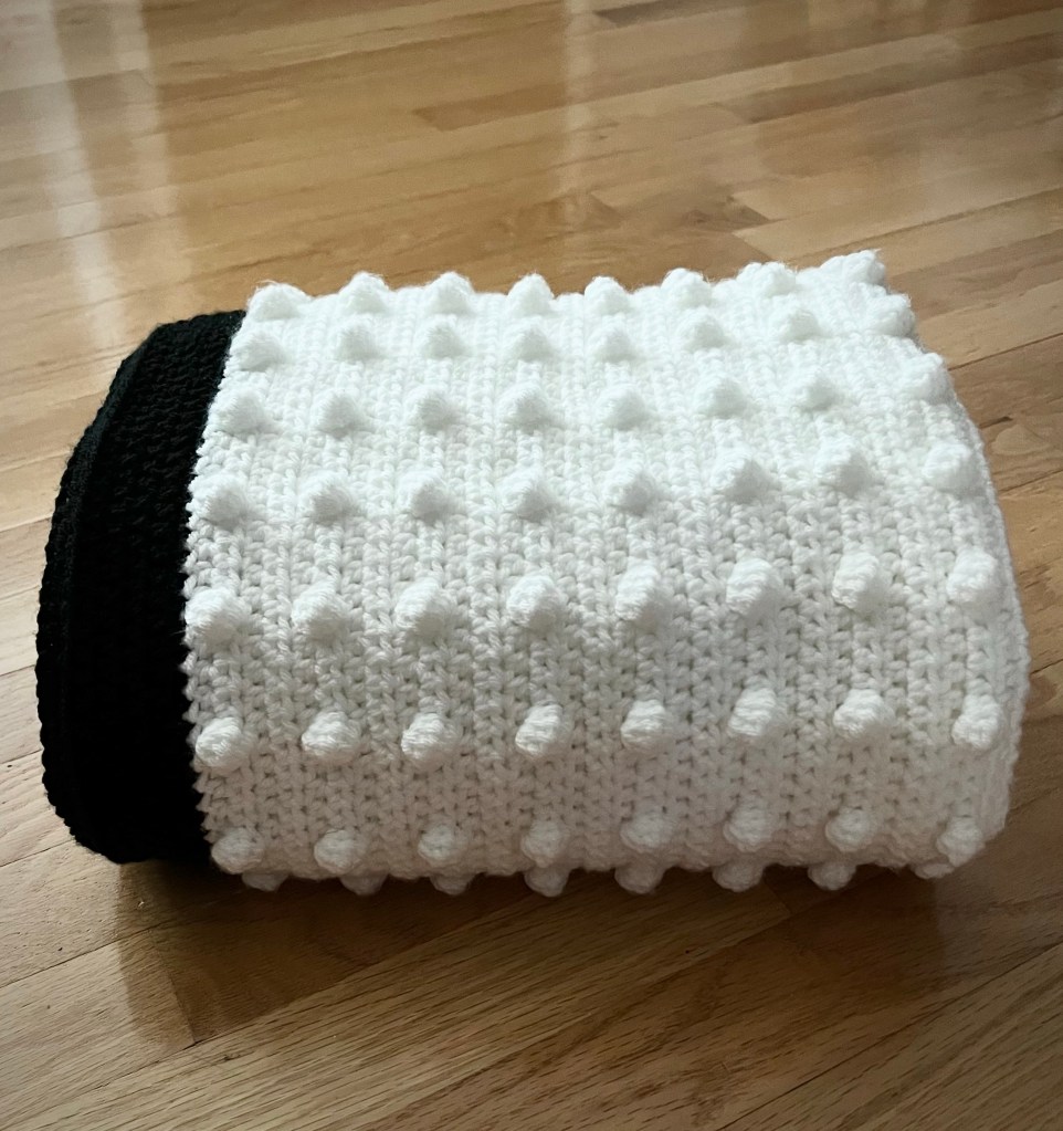 I used Yarn Bee Soft & Sleek yarn in White and Black with an H/5mm hook to make the blanket.