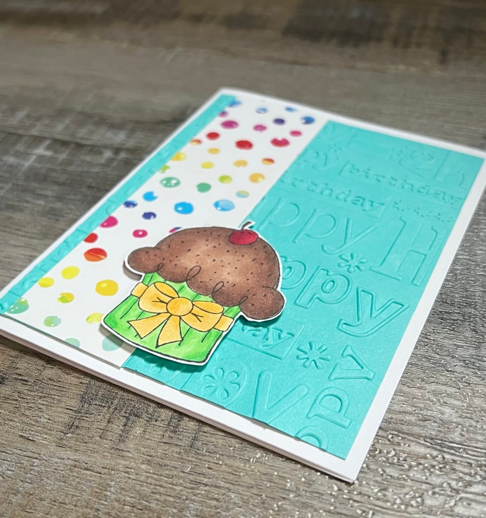 The next card is made with the cute cupcake from the More Than Cupcakes stamp set from Unity Stamp Company. I stamped the image on white card stock with Memento Tuxedo Black ink, colored it with Copic markers, and cut it out. I embossed a piece of turquoise card stock with a birthday embossing folder (similar to this or this) and attached it to a white card. I attached a strip of patterned paper and then added the cupcake using foam tape.