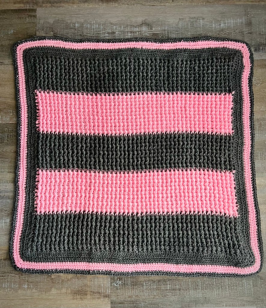 The yarn I used was Red Heart Super Saver in Grey Heather and Petal Pink. I used an I/5.5mm hook to stitch up my blanket.