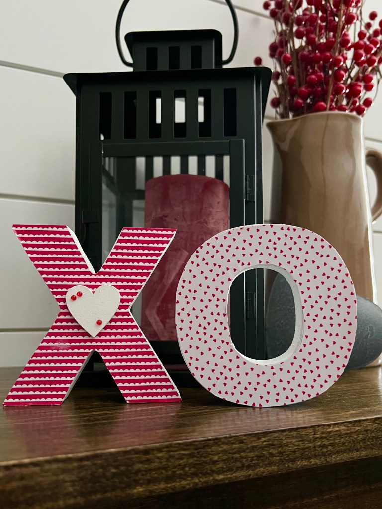 I found my X and O at Target, but most craft stores have chunky wood (or papier mâché) letters, often in different sizes. (I made some 8-inch papier mâché letters a few years ago in this post.) You can also paint your letters pink or red instead of white or add other cute embellishments to them.