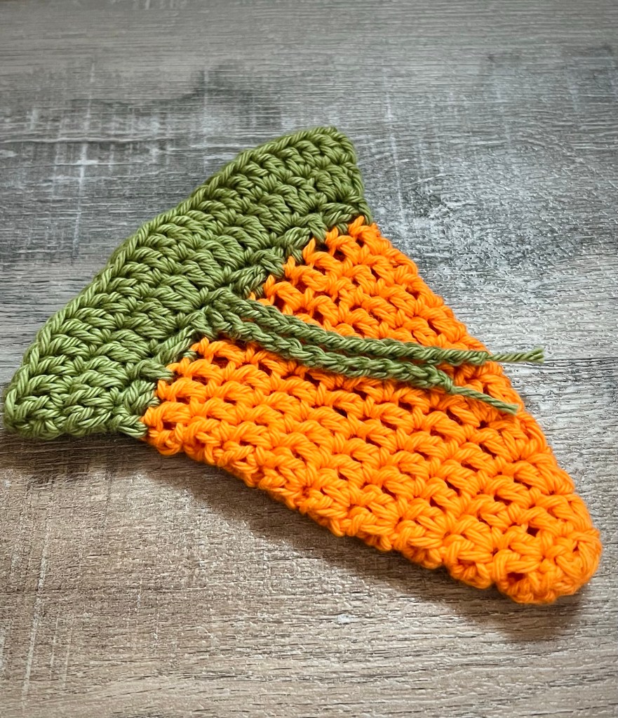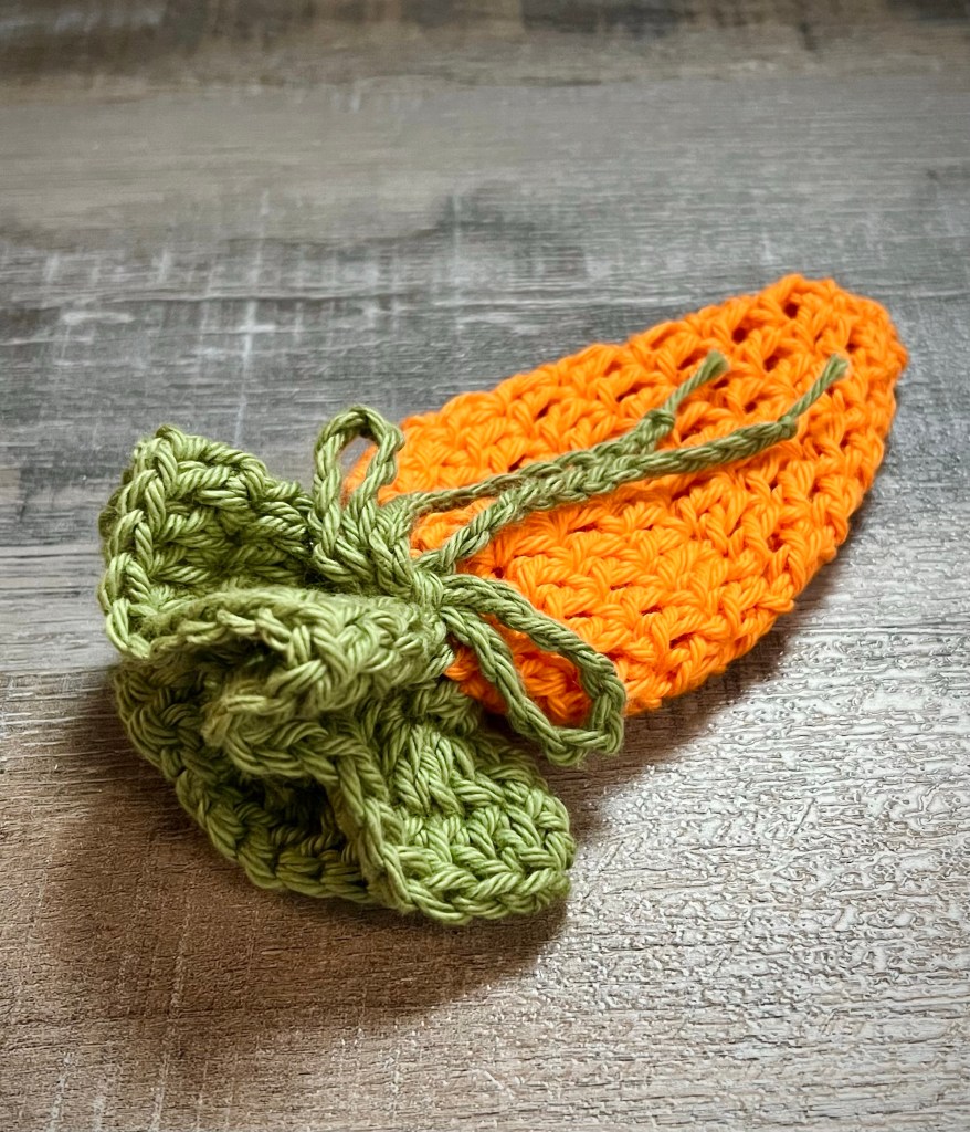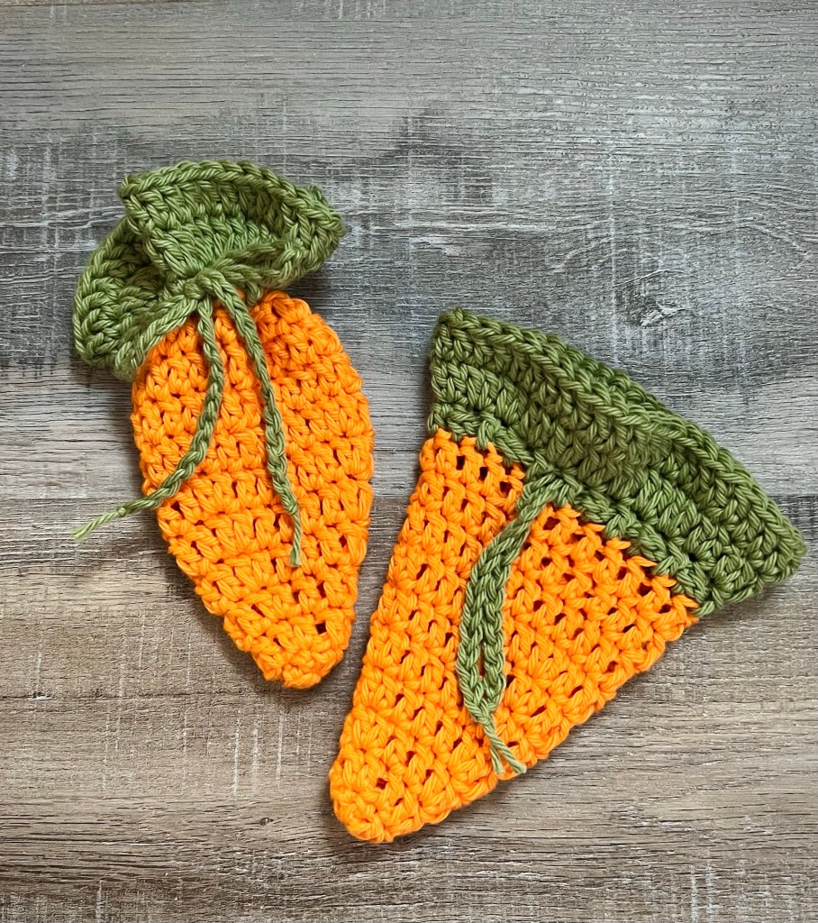 I used cotton yarn, but you can stitch up your Drawstring Treat Bags using any of your favorite size 4 yarn. 🥕