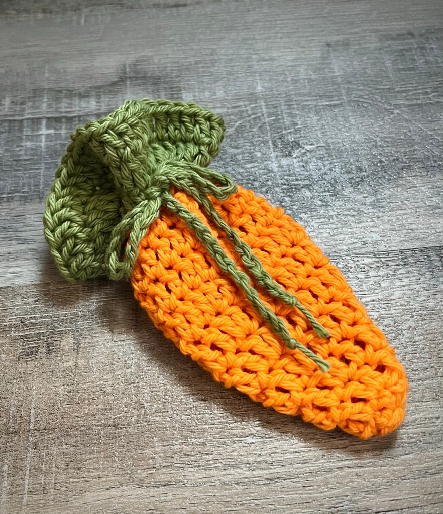 I’m sharing my free pattern for this cute Crochet Drawstring Carrot Treat Bag below. 🥕 It’s super quick to stitch up and is so fun for sharing Easter treats! Fill it with your favorite wrapped candies and it’s sure to bring a smile.
