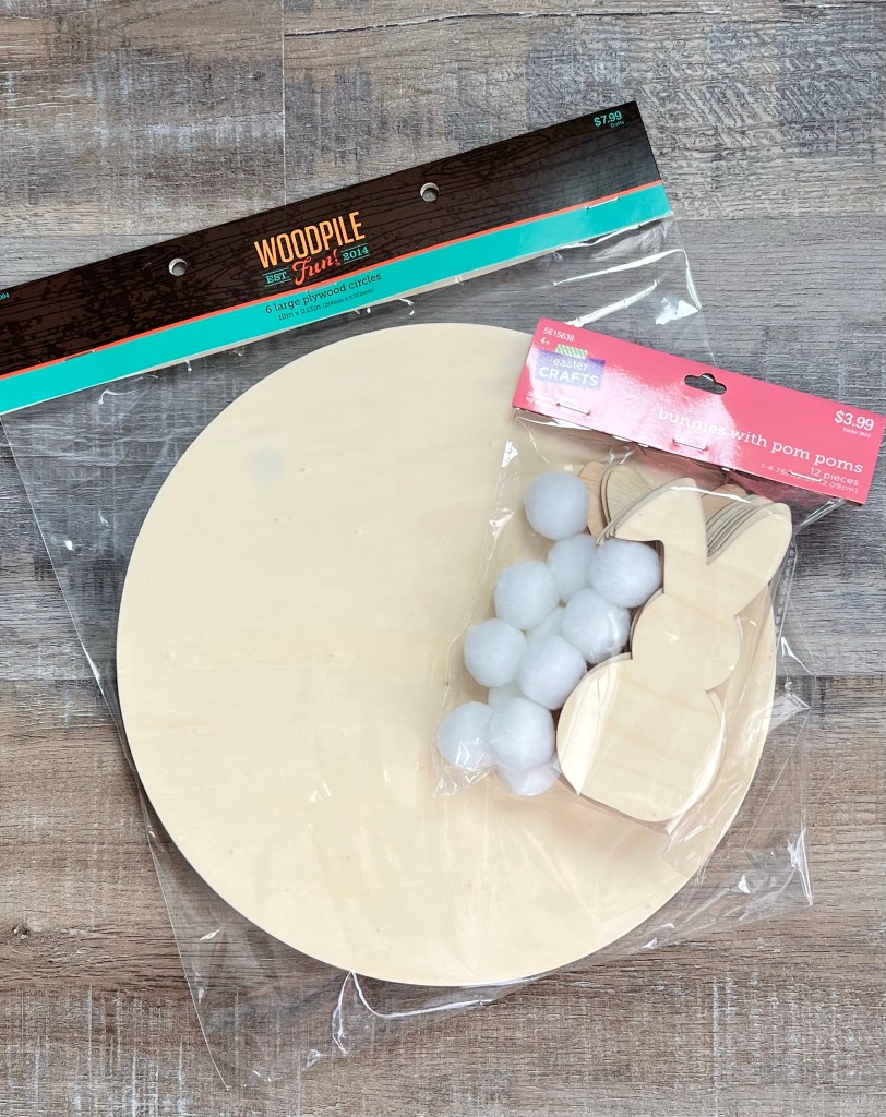 I found these cute little bunny cutouts at Hobby Lobby in their Easter section. There are 12 bunnies – 6 of each silhouette – along with 12 bunny tail pom poms. And in case you didn’t know, all of the Easter merchandise is 40% off! I also picked up a package of their 10-inch plywood circles to use as a base to make this fun Happy Easter Bunny Wreath.