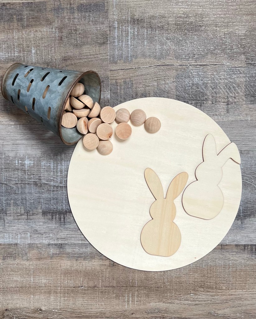 You’ll need a 10-inch wood circle and 2 wood bunny silhouettes. My wood circle came in a package of 6 from Hobby Lobby. My bunnies are also from Hobby Lobby. They came in a package of 12 along with little white pom poms for the tails. You’ll also need some 1/2-inch split wood beads like these and dark brown and white acrylic paint .