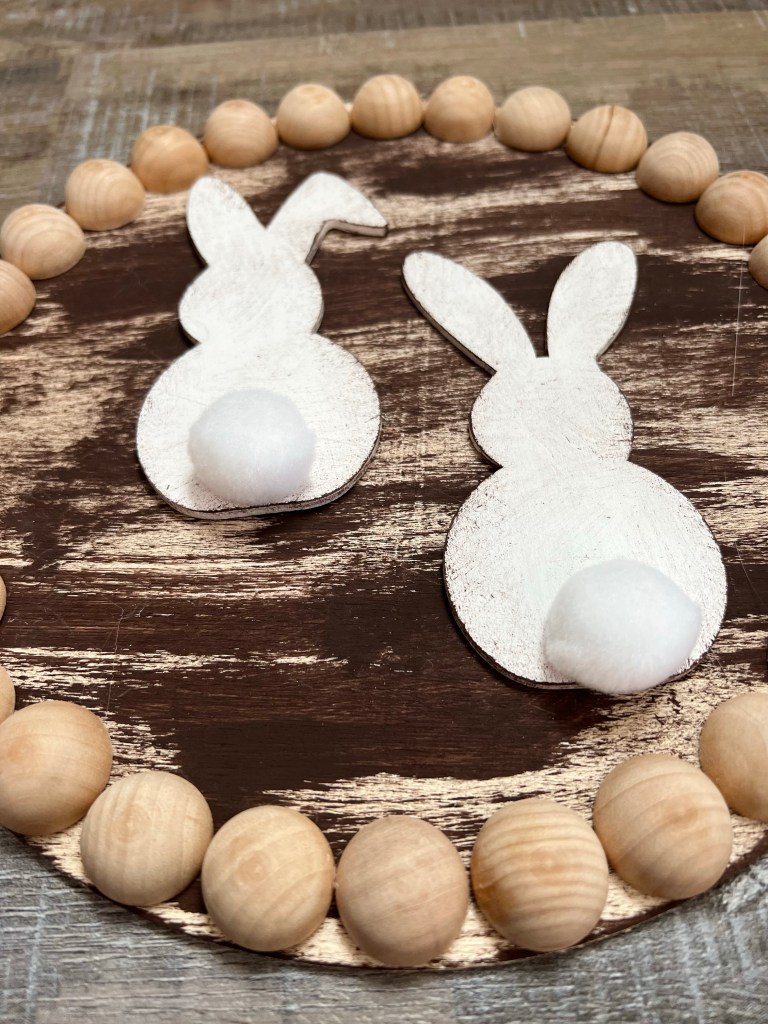 I attached the split wood beads to the wood circle with hot glue. I hot glued the bunnies to the center of the circle and glued on the cute little pom pom tails.