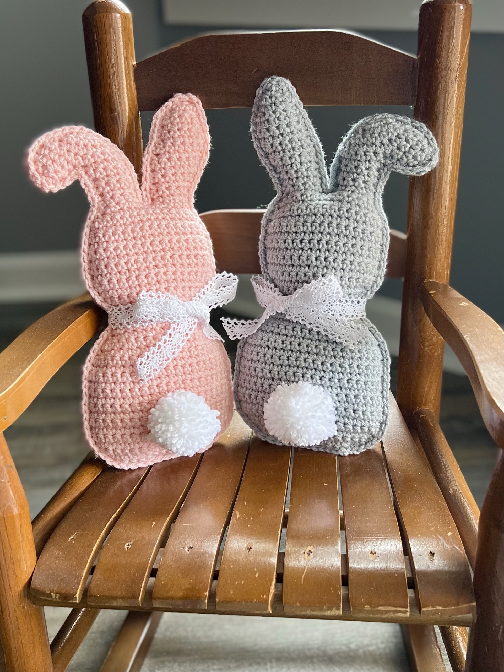 It’s a super easy pattern to follow and works up very quickly. It’s worked in 2 pieces that you crochet together and stuff with Poly-Fil. I used Yarn Bee Soft & Sleek yarn in Soft Pink and Silver Grey with an I/5.5mm hook to stitch up my bunnies.