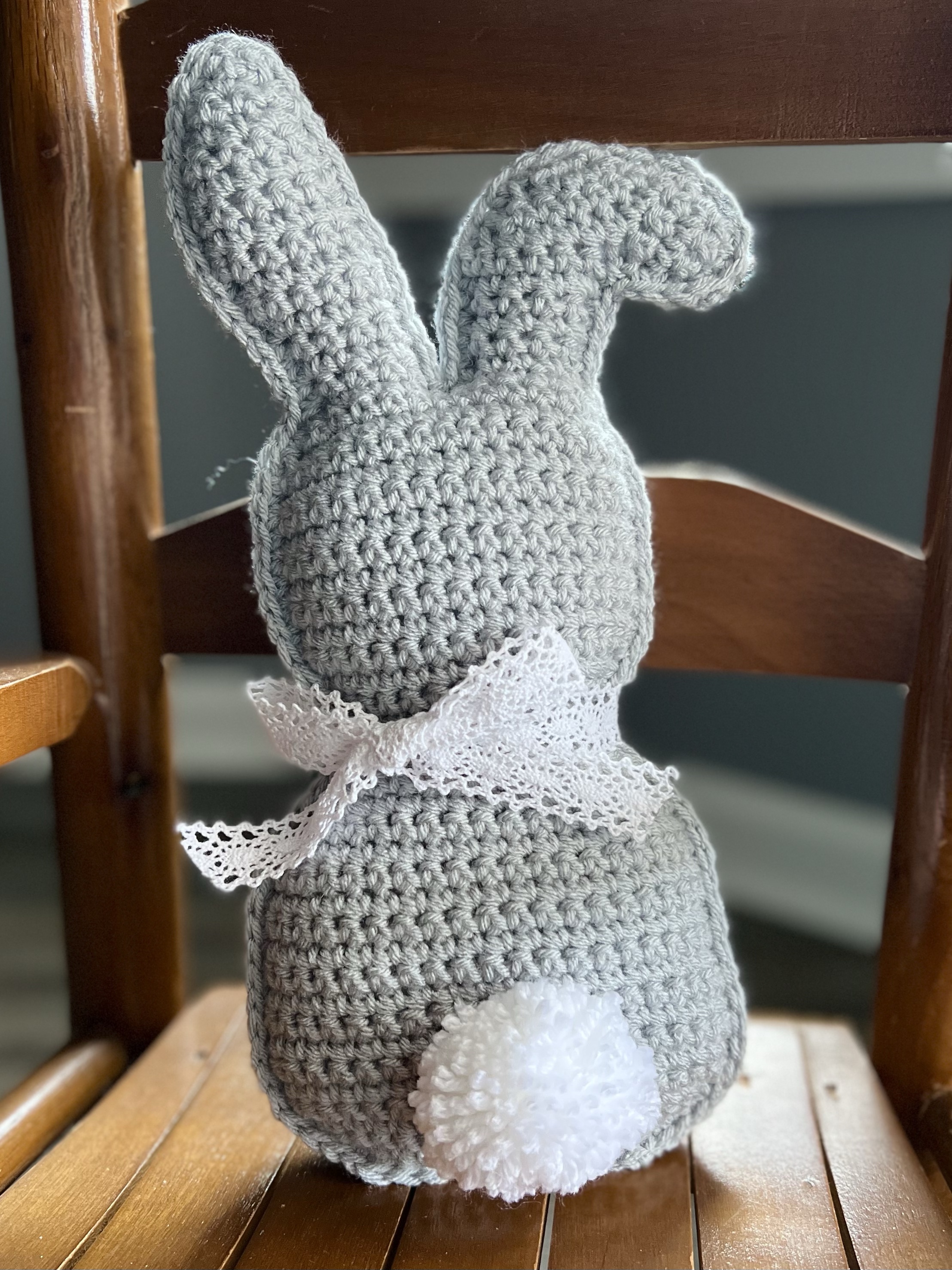 I found the cutest Crochet Easter Bunny pattern here at Winding Road Crochet! It’s a free pattern and I just fell in love with the little bent ear – how cute is that?!?! Adding a pom pom tail and a lace ribbon bow makes it such a sweet bunny.