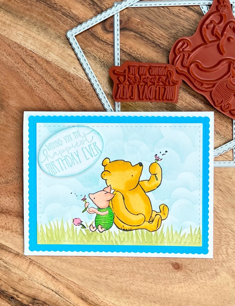 I used the Winnie the Pooh: How Do You Spell Love? set to make this sweet Pooh and Piglet Birthday card. I stamped the image with Memento Tuxedo Black ink on white card stock and colored it with Copic markers. The Copic colors I used for Pooh were Y26, Y19, and Y21. The colors for Piglet are R01 and R02 with YG07 and YG05 for his little outfit.
