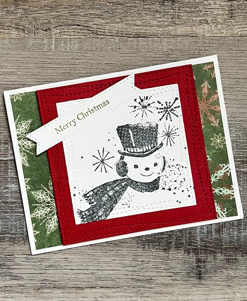 I almost didn’t make it, but I managed to design a Christmas card for March! I’m trying to create a new design each month and make a few of each design to have ready for sending in November. This month’s card is super quick and easy – and I love the vintage feel of this cute snowman. π