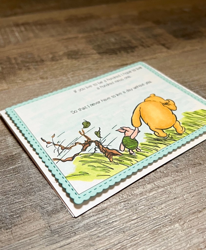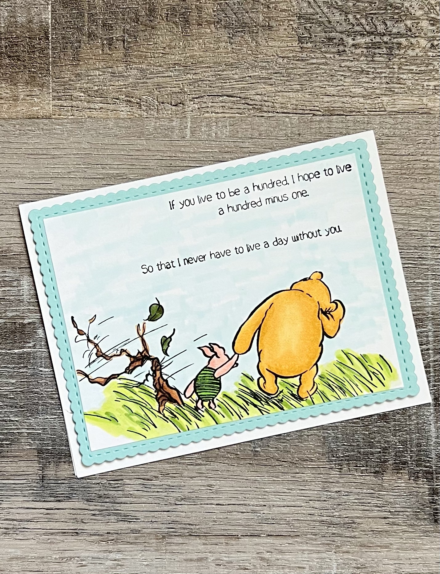 The Winnie the Pooh: A Hundred Minus One stamp set from Unity Stamp Company was the perfect choice for making my anniversary card for him. I have loved Winnie the Pooh forever and the sentiment says it all. 🙂